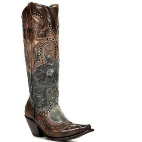 Women Biker Cowgirl Cowboy Boots Studded Block Heel Mid Wide Calf Western Shoes