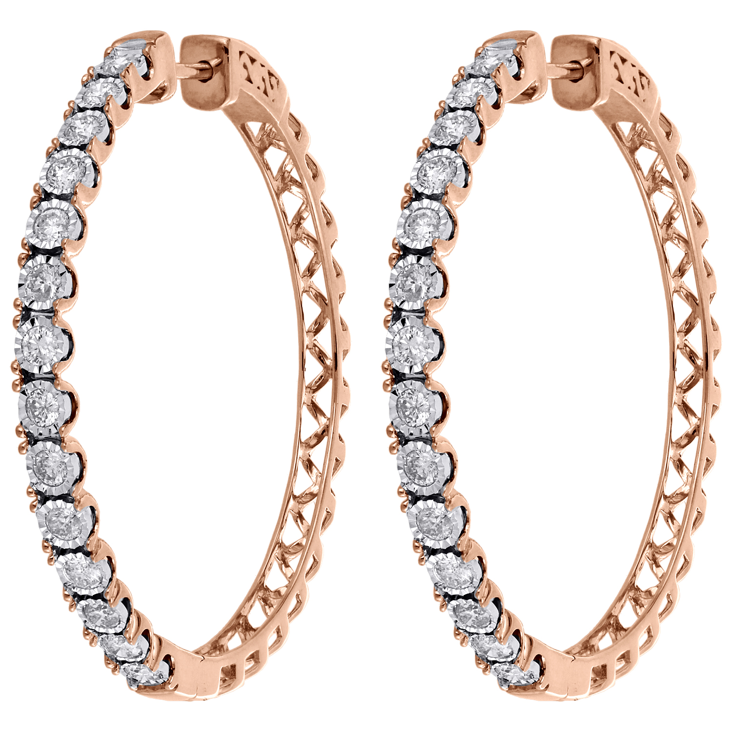 Color, sparkle and style combine to form these amazing diamond hoop earrings. Crafted in solid 10K Rose Gold, these hoop earrings feature 1 row of shimmering white diamonds. Perfect for any-time wear, these earrings captivate with 1.50 ct. t.w. of genuine round cut diamonds. Polished to a bright shine, all round cut diamonds are in a bezel setting, making the overall appearance larger and lustrous. These earrings secure comfortably with snap / hinged closure backing for secure wear. These diamond hoops are an elegant choice anytime and will make a great addition to your jewelry collection with this classic piece.