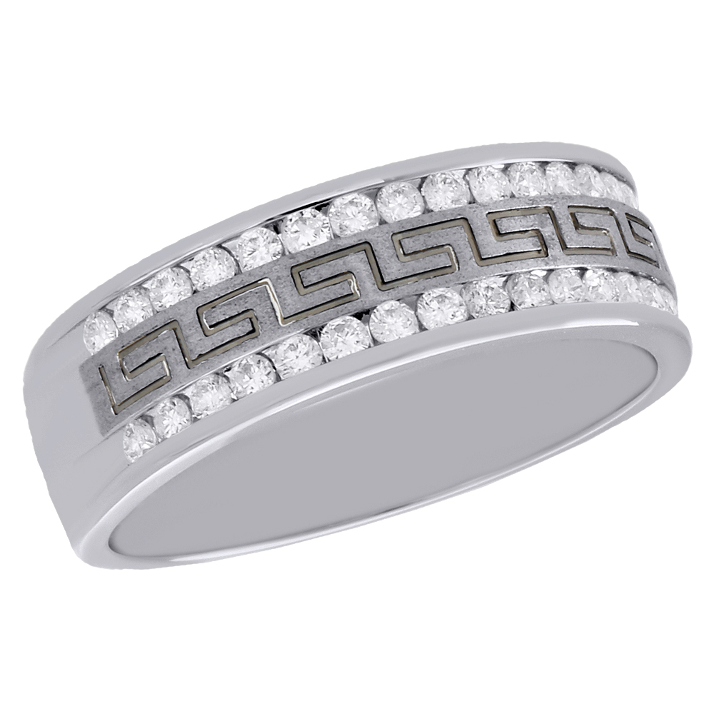 Jewelry For Less designers present this beautiful wedding band, crafted in real 14K White Gold with a brushed finish and a black enameled Greek Key design in the center. The wedding band also have two rows of white diamonds. This handsome and distinguished wedding band features stunning diamonds aligned across the band. Sectioned detailing gives the frame depth and dimension. This wedding band features channel set shimmering diamonds across the top of the band. Radiant with 0.50 ct. total weight of diamonds and buffed to a polished luster, this wedding band is a thoughtful symbol of your marriage commitment. This band is 7mm wide and weighs 6.2 grams.