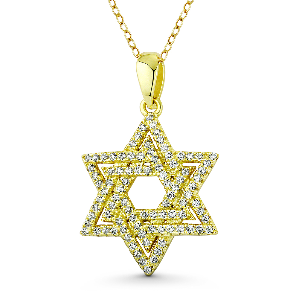 The featured pendant is cast in .925 sterling silver and showcases a Star of David charm paved with cubic zirconia crystals. The pendant is then plated with 14k yellow gold and finished with a sturdy bail to accommodate most standard chains.