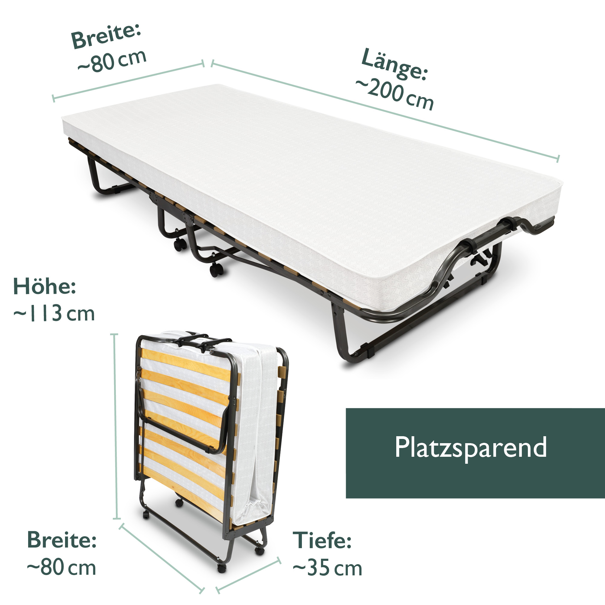 Beautissu Gästebett Venetia - 80x200 cm - klappbar mit Matratze, 4 Rollen und Schutzhülle