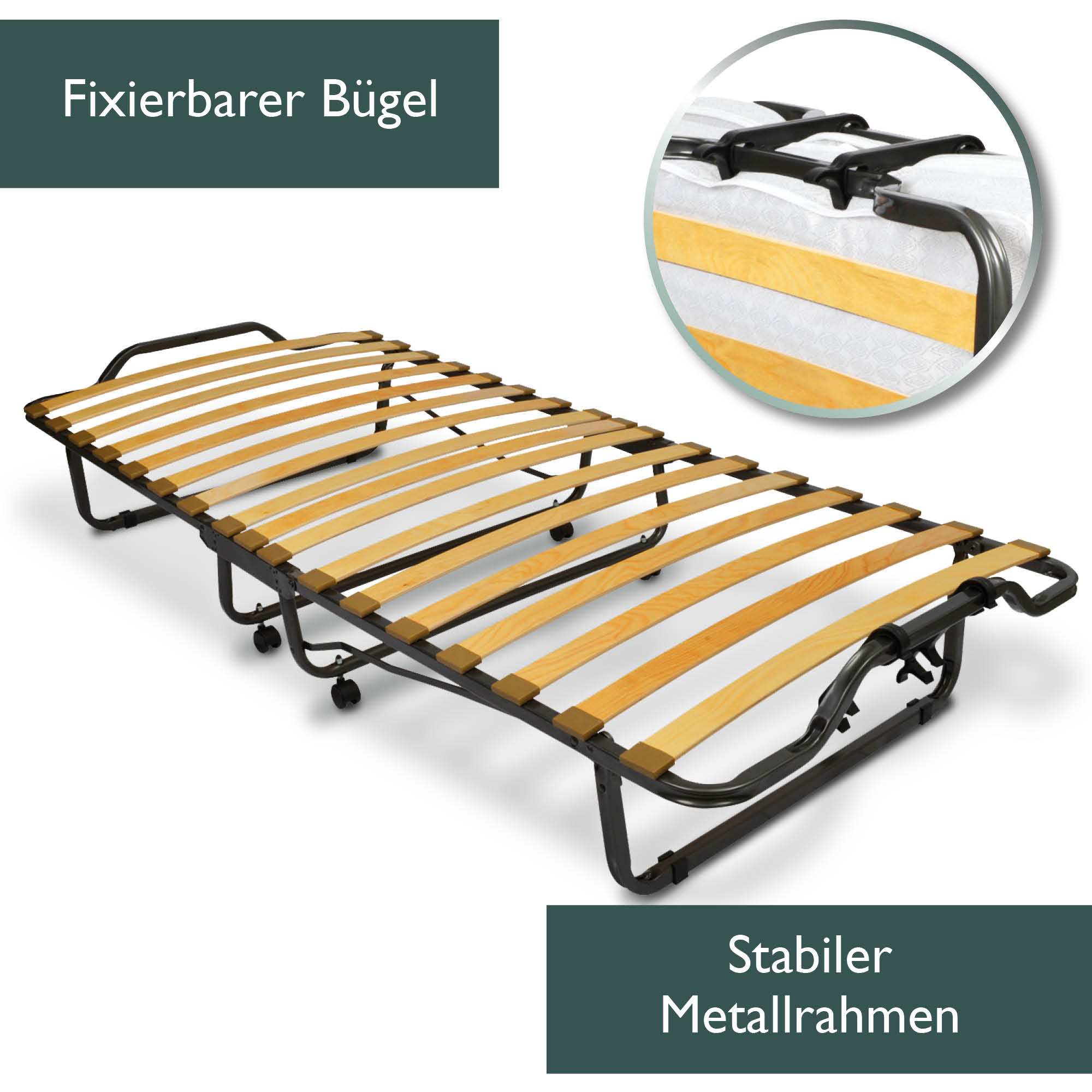 Das Gästebett verfügt über einen stabilen Lattenrost aus 8 mm starken Federholzleisten, die für den nötigen Komfort sorgen. Ein Gestell aus Stahl mit 4 Stützen ermöglicht eine Belastbarkeit bis ca. 100 kg.