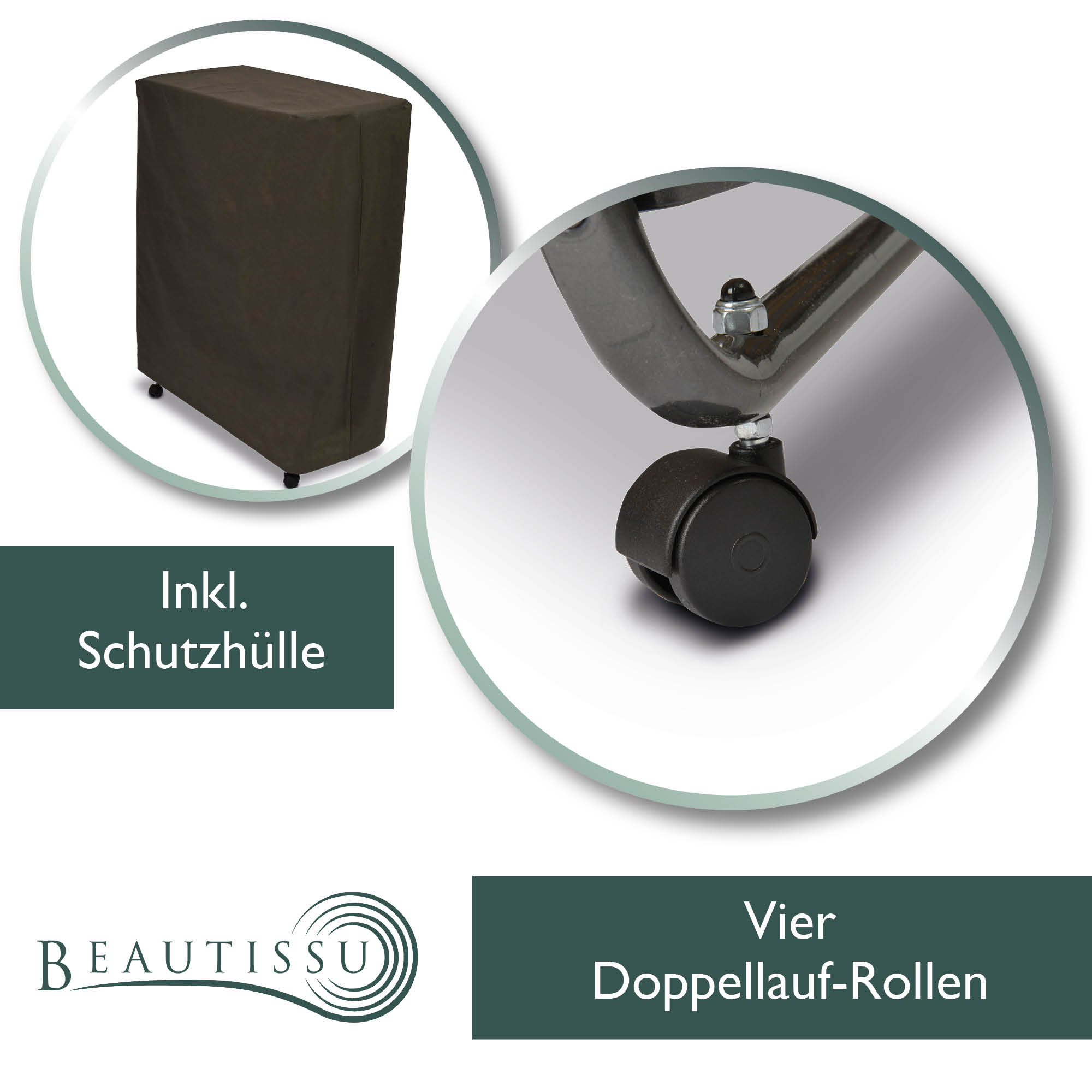 - Konstruktion: Stahlrohr mit 4 Stützen und 4 beweglichen Kunststoffrollen
