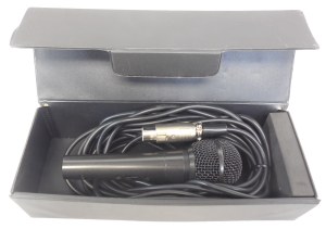 This is a Radio Shack PRO-3004 Unidirectional Dynamic microphone, XLR 3-pin, 500 ohm. It comes with a 20' XLR to 1/4" jack cord, and in the original hard case.