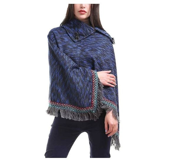 ?Mad Style Blurred Stripe Mock Turtleneck Poncho Blanket Scarf with Fringe (Blue)