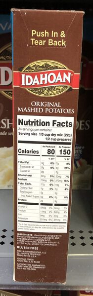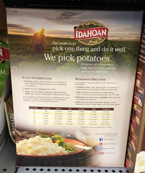 Instructions: Stove top directions: 1. Combine water, salt and margarine* according to chart below. For best results, do not add milk until step 3. 2. Heat to a boil, remove from heat. 3. Add cold milk; stir in potatoes gently and let stand until moist. Whip lightly with fork and serve.For a creamier mashed potato, stir in additional hot water or milk. For a firmer mashed potato, stir in additional potatoes. Less salt can be added if desired. Microwave Directions: All microwaves vary and heating times may have to be adjusted. 1. Combine water, salt, and margarine* according to chart below in microwave-safe serving bowl. 2. Heat to a boil in microwave on high setting. Note: Microwaving not recommended for over 6 servings. 3. Remove from microwave. Caution: Serving bowl and liquid will be hot. 4. Add cold milk; stir in potatoes gently and let stand until moist. Whip lightly with fork and serve.
