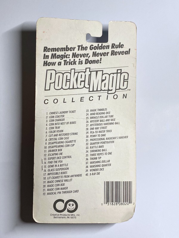 Manufactured by Creative Products Mfg., Inc., this was one trick in a collection of 40 other individual magic tricks. The company is still in existence, making magic tricks, jokes and gags and is named Kalan.