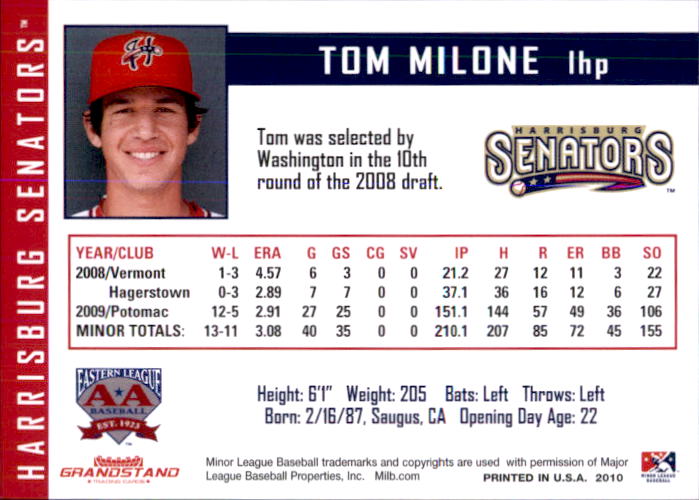 2010 Harrisburg Senators Grandstand #16 Tom Milone Saugus California CA Card