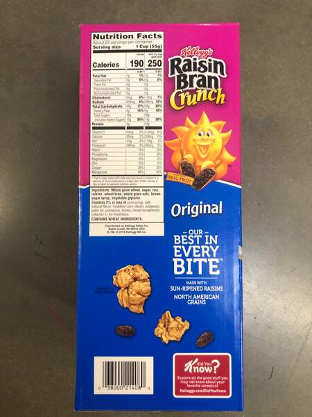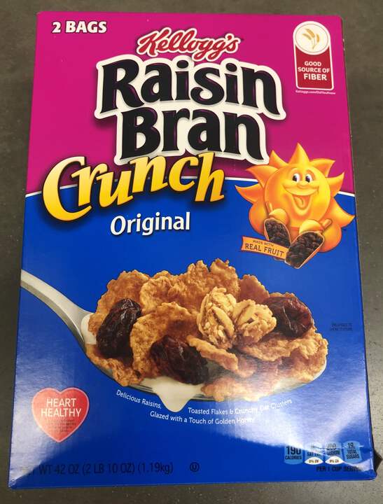 Wake up with Sunny and the simple goodness of Kellogg's Raisin Bran Crunch—a deliciously crafted, wholesome cereal that helps energize the start of your day. This classic cereal is made with crispy, toasted bran flakes balanced with the satisfying taste of sweet raisins, crunchy oat clusters and just a touch of honey. Just as nutritious as it is delicious, this heart-healthy* breakfast cereal is low fat and contains a good source of fiber and essential vitamins and minerals to help you start your day off strong. Whether you enjoy your Raisin Bran Crunch in a bowlful at breakfast time, as an afternoon snack, or straight from the box after your workout, Kellogg's Raisin Bran Crunch Cereal lets you rise, shine and make the most of your day.