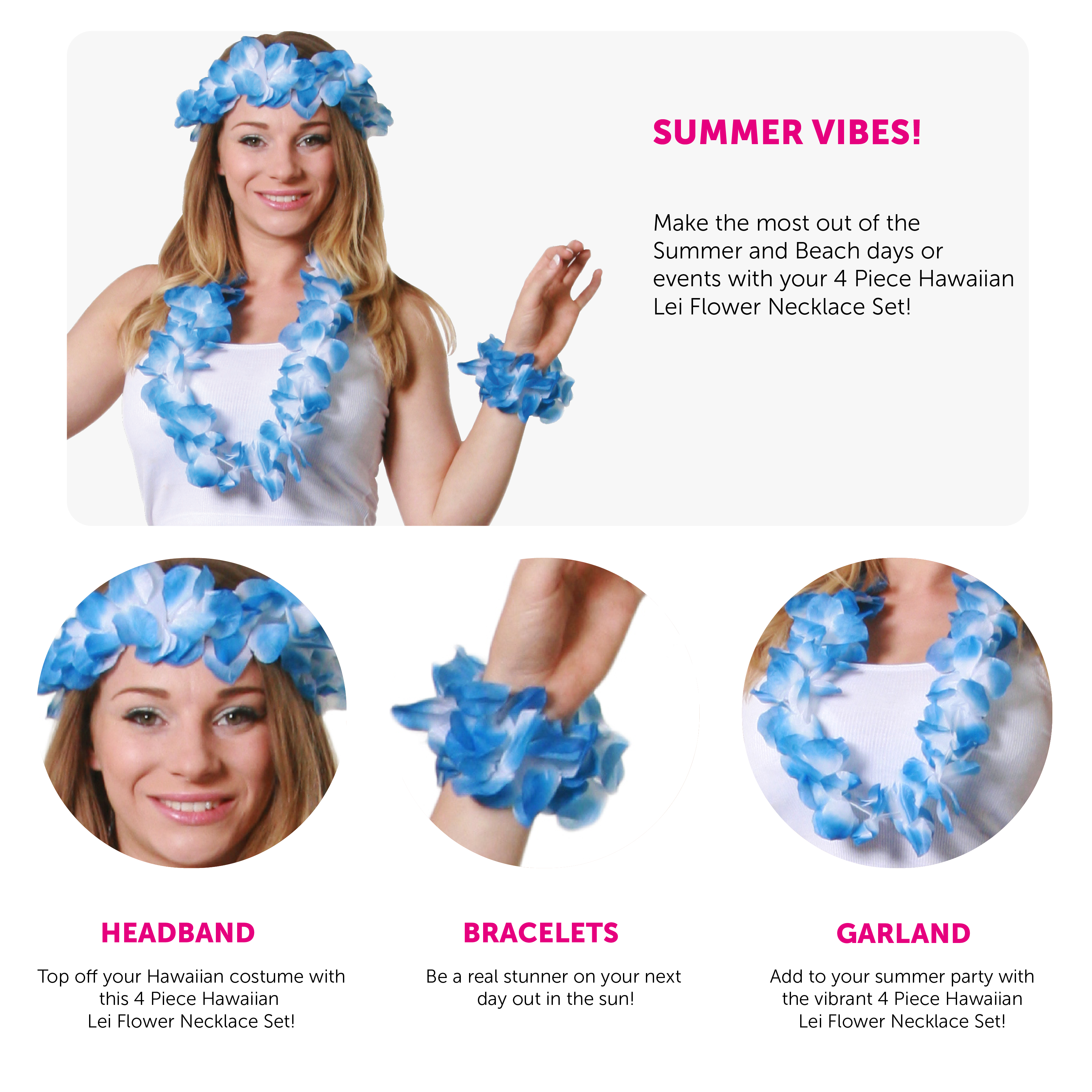 4 PIECE HAWAIIAN LEI FLOWER NECKLACE SET: Make the most out of the Summer and Beach days or events with your 4 Piece Hawaiian Lei Flower Necklace Set and be a real stunner on your next day out in the sun!