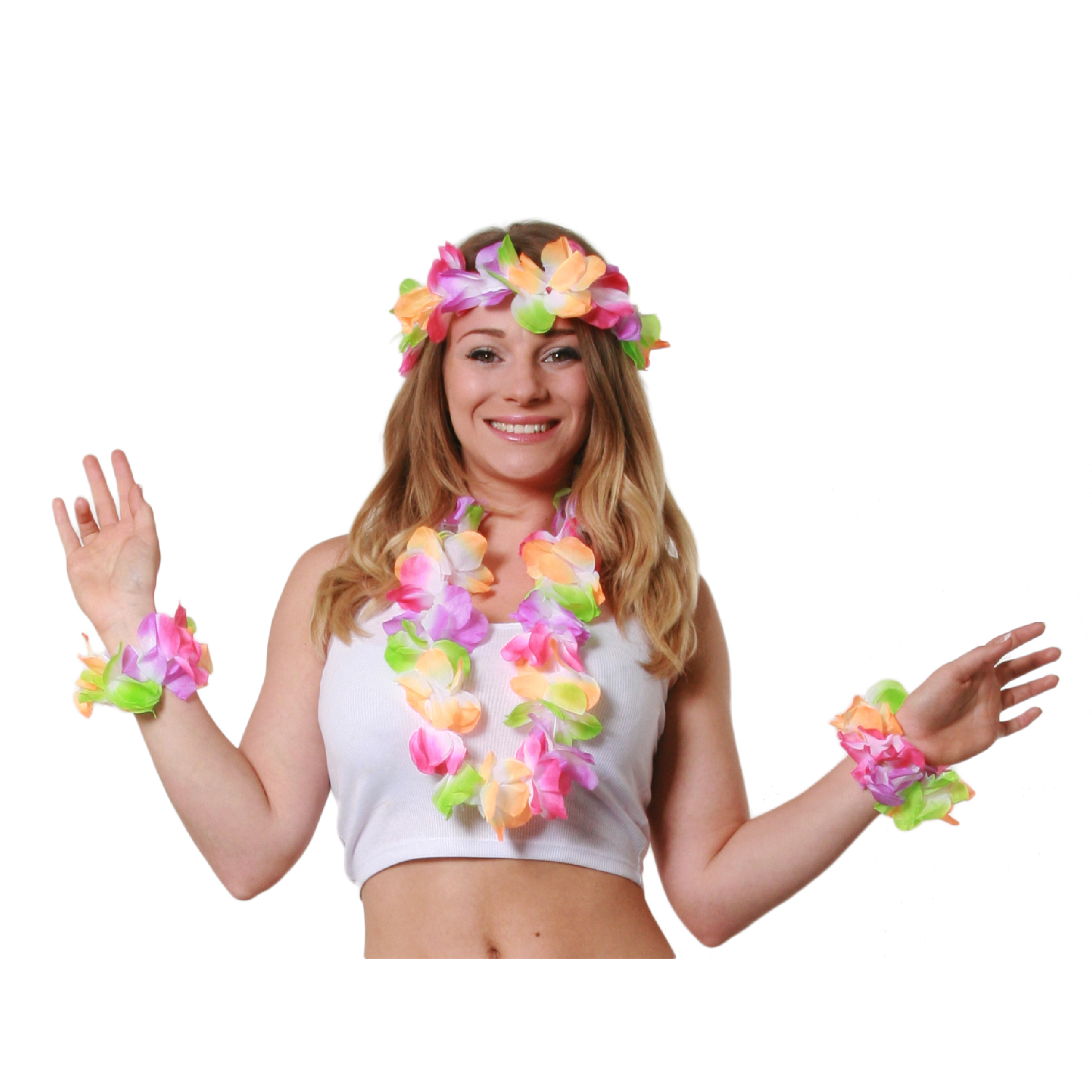 4 PIECE SET INCLUDES: Your 4 Piece Hawaiian Lei Flower Necklace Set includes an 18” Hula Flower Garland, a matching Lei headband, and 2 matching Lei flower bracelets, a neat and summery Hawaiian set!