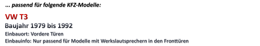 Einbau Informationen für Komponenten Lautsprecher: Die Hochtöner (inkl. Frequenz-/Kabelweichen) werden anstelle der Originalhochtöner nach eigenem ermessen eingepasst, eingeklebt oder ggf. aufgebaut (Zubehör inkl.). Die Tieftöner (ggf. inkl. Einbauadapter) werden anstelle der Originallautsprecher eingebaut. Die mitgelieferten Frequenz-/Kabelweichen müssen zwingend verbaut werden. Bei nicht Installation kann dies zu Schäden an den Komponenten führen! Es werden noch Schrauben und/oder Kabel benötigt. Der Einbauort ist oben angegeben.