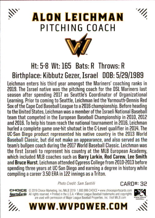 2019 West Virginia Power Choice #32 Alon Leichman Pitching Coach Israel Card