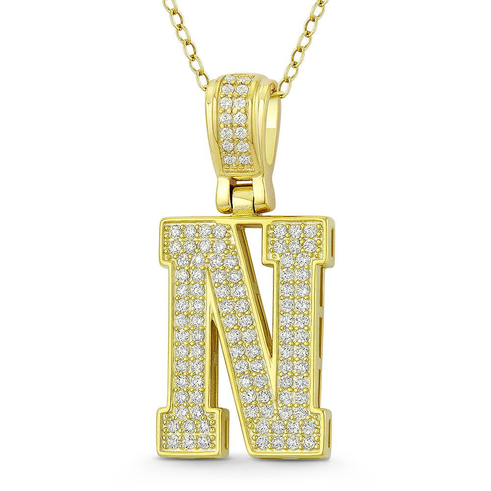 The featured pendant is cast in .925 sterling silver and showcases a block script initial "N" design paved w/ cubic zirconia crystals. The pendant is then finished with a sturdy bail that will accommodate most standard chains and plated with 14k yellow gold.