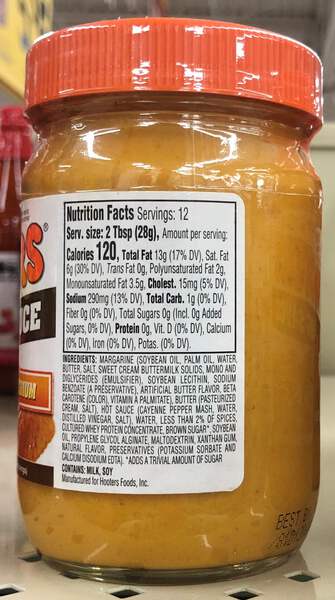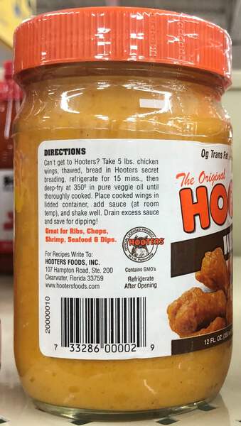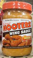 Recreate the flavor of your favorite wings and enjoy them anytime from the comfort of your home with this Hooters Wing Sauce. It is delicious on ribs, pork chops, shrimp, seafood and dips. The medium wing sauce has a mild spicy taste. One 12-oz jar serves approximately 5 lbs of wings. Simply shake the Hooters Wing Sauce well and then apply. Hooters Foods Hooters Wing Sauce, 12 oz: Wing sauce, medium The original; a thrill on the grill BBQ Serves approximately 5 lbs of wings Delicious for ribs, chops, shrimp, seafood and dips 120 calories per serving Refrigerate the BBQ wing sauce after opening Contains soy and milk Net weight: 12 oz (355ml) For recipes write to Hooters Foods, Inc., 107 Hampton Road, Ste. 200 Clearwater, Florida 33759 Ingredients: Ingredients: MARGARINE (SOYBEAN OIL, PARTIALLY HYDROGENATED SOYBEAN OIL, WATER, SALT, BUTTER, BUTTERMILK SOLIDS, MONO- AND DIGLYCERIDES, SOY LECITHIN, SODIUM BENZOATE [PRESERVATIVE], ARTIFICIAL FLAVOR, BETA CAROTENE [COLOR], VITAMIN A PALMITATE), BUTTER (PASTEURIZED CREAM, SALT), HOT SAUCE (AGED RED PEPPERS, DISTILLED VINEGAR, SALT), WATER, SPICES, DAIRY FLAVOR (CULTURED WHEY PROTEIN CONCENTRATE, MALTODEXTRIN), BROWN SUGAR, SOYBEAN OIL, PROPYLENE GLYCOL ALGINATE, XANTHAN GUM, POTASSIUM SORBATE (A PRESERVATIVE), SPICE EXTRACTIVES, CALCIUM DISODIUM EDTA (PRESERVATIVE). Directions: Instructions: Directions (Shake well).Can't get to Hooters? Take 5 lbs. chicken wings, thawed, bread in Hooters secret breading, refrigerate for 15 mins., then deep-fry at 350° in pure veggie oil until thoroughly cooked. Place cooked wings in lidded container, add sauce (at room temp), and shake well. Drain excess sauce and save for dipping! Safe Handling Instructions: DNFEAT1