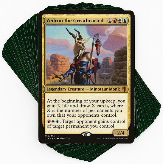 A deck for the truly cunning! Use Zedruu's ability to donate problematic permanents to your opponents and reap the rewards in lifegain and card draw, all while staying one step ahead of the table.