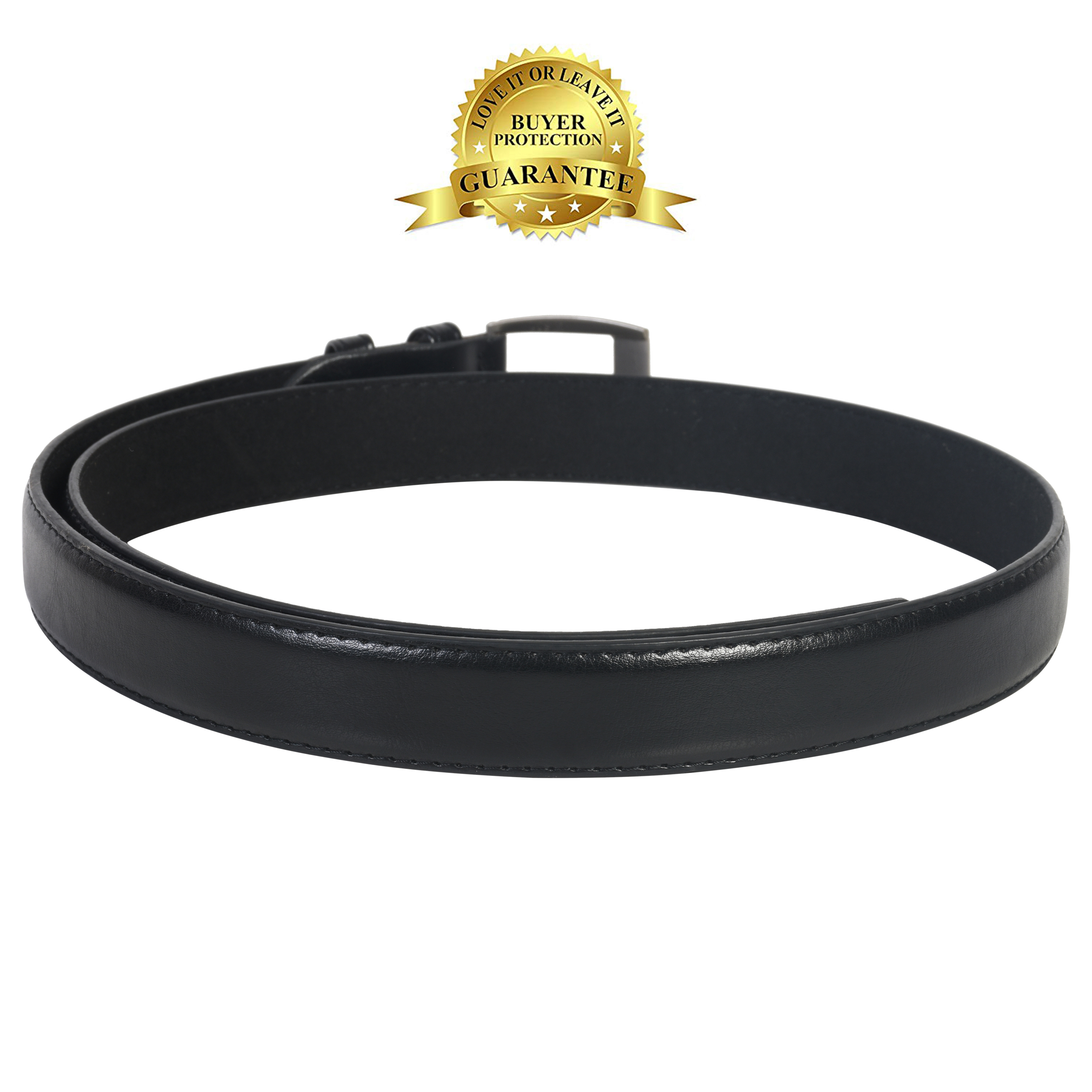 A Genuine Leather Dress belt. 1.1/8-inch-wide belt standard width for all dressy and casual belt loops not too wide or narrow. Smooth sleek sturdy leather belt with straight accurate stitching and 5 holes in the belt in right placement. Brushed silver finish scratch-resistant buckle is sturdy enough to hold up your pants. It's a good stylish leather belt. Very hard to find belt. A REALLY GREAT BUY.