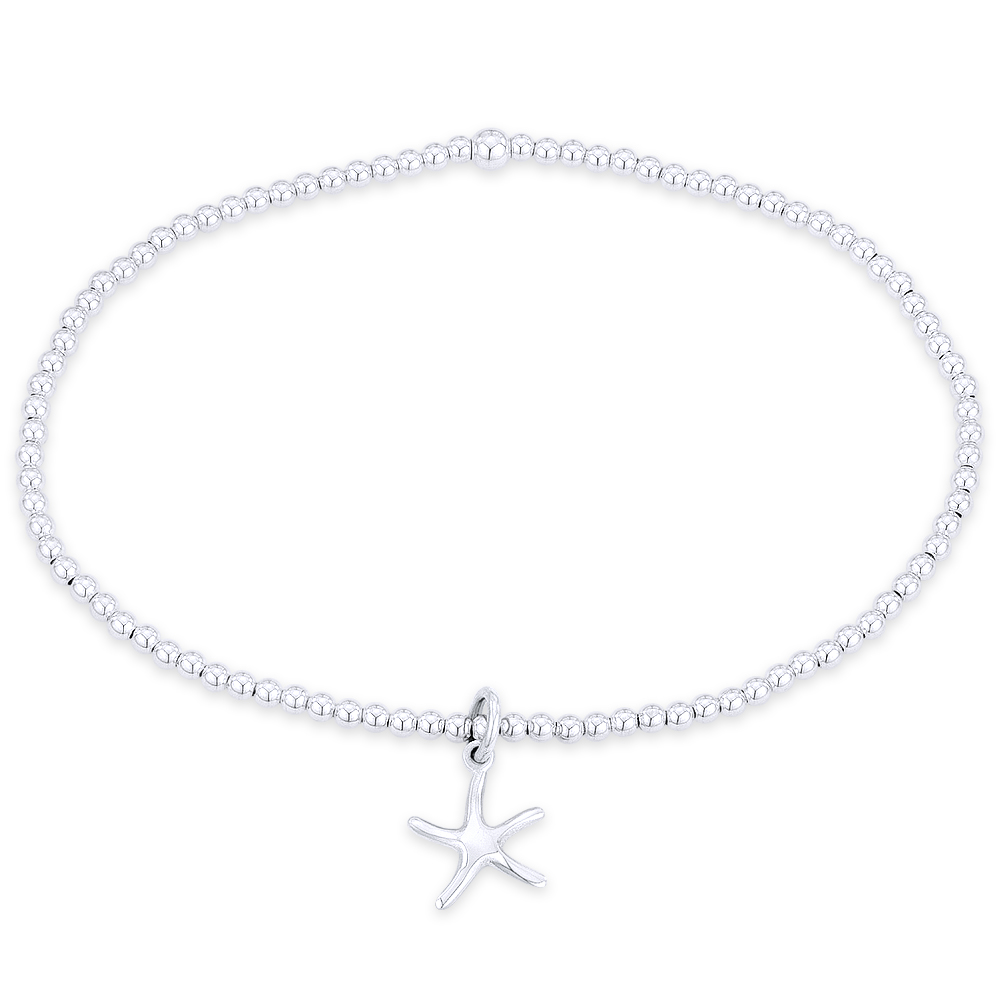 The featured charm bracelet is made up of polished 2mm ball beads & a 5-legged starfish charm centerpiece all cast in .925 sterling silver & strung together by stretchable nylon.