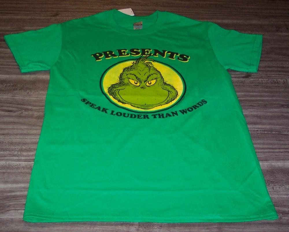 This is a Dr. Seuss THE GRINCH WHO STOLE CHRISTMAS "Presents Speak Louder Than Words" T-shirt. It is a size SMALL, and it is NEW with the tag. It is 18 inches from armpit to armpit and 28 inches in length. The Print is made to look vintage. Combine auctions to save on shipping. D2AG