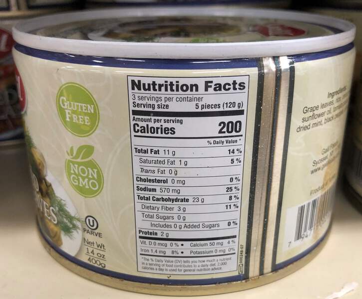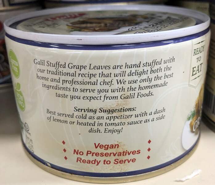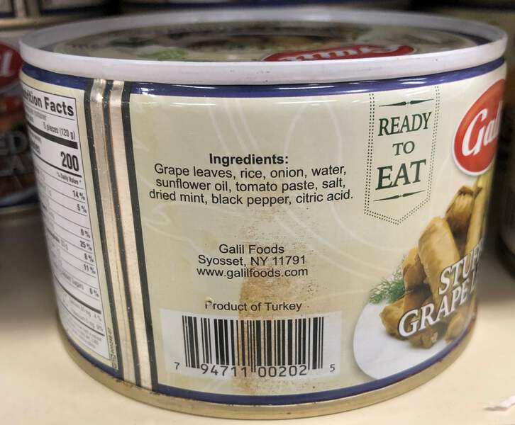 Ingredients: Grape Leaves, Sunflower Oil, Dried Mint, Tomato Paste, Onions, Water, Rice, Salt, Dried Mint, Black Pepper, Citric Acid.