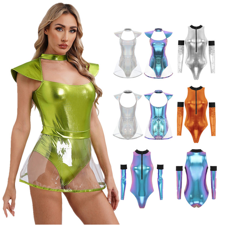 Ärmellos, hoher Kragen und langer, schwarzer Reißverschluss, der vom Bauchnabel bis zum Hals reicht, kommt mit einem G-String.