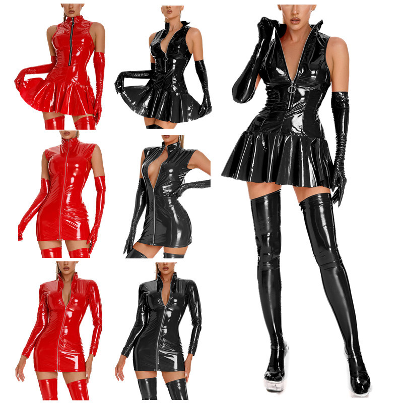 Damenmode Stretchy PU Leder Bottom Flare Mini Dress Clubwear.