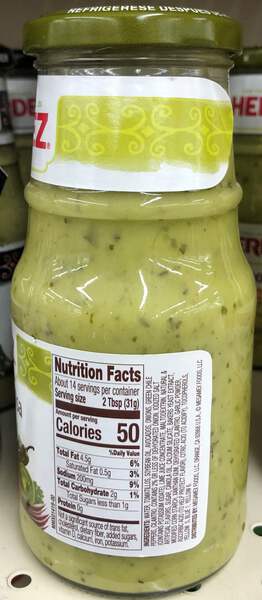 Ingredients: Water, Tomatillos, Soybean Oil, Avocados, Onions, Green Chile Peppers, Cilantro, Natural & Artificial Flavors, Less than 2% of Dehydrated Onion, Iodized Salt (Contains Potassium Iodate), Lime Juice Concentrate, Xanthan Gum, Dehydrated Cilantro, Garlic Powder, Ascorbic Acid (to Help Protect Flavor), Citric Acid (to Acidify), Sodium Erythorbate, Yellow 5, Yellow 6, Blue 1.