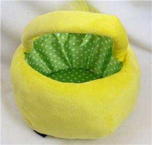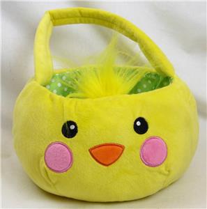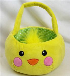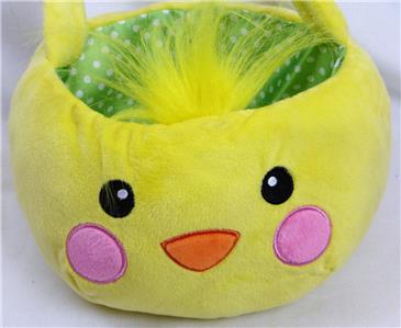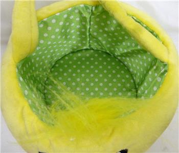 All ready for you to fill with Easter candy, this yellow cloth duck basket is too cute. The basket is about 6” tall and the handle adds another 8” for a total of 14” tall. He has a yellow tuft of hair and embroidered/appliqued face with orange beak, pink cheeks, and black eyes! A soft green with white polka dots lining covers the plastic inner lining to keep the shape and finishes off the basket.