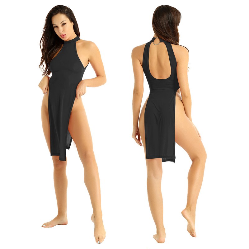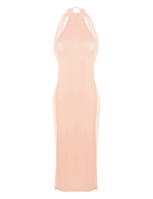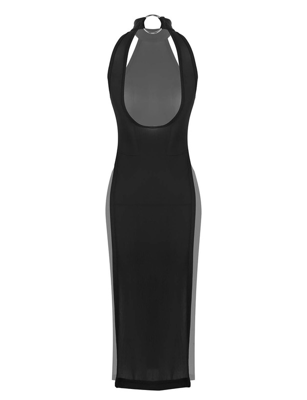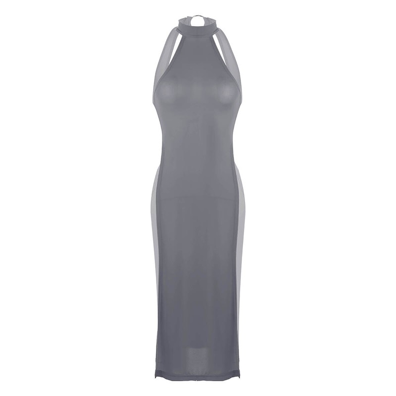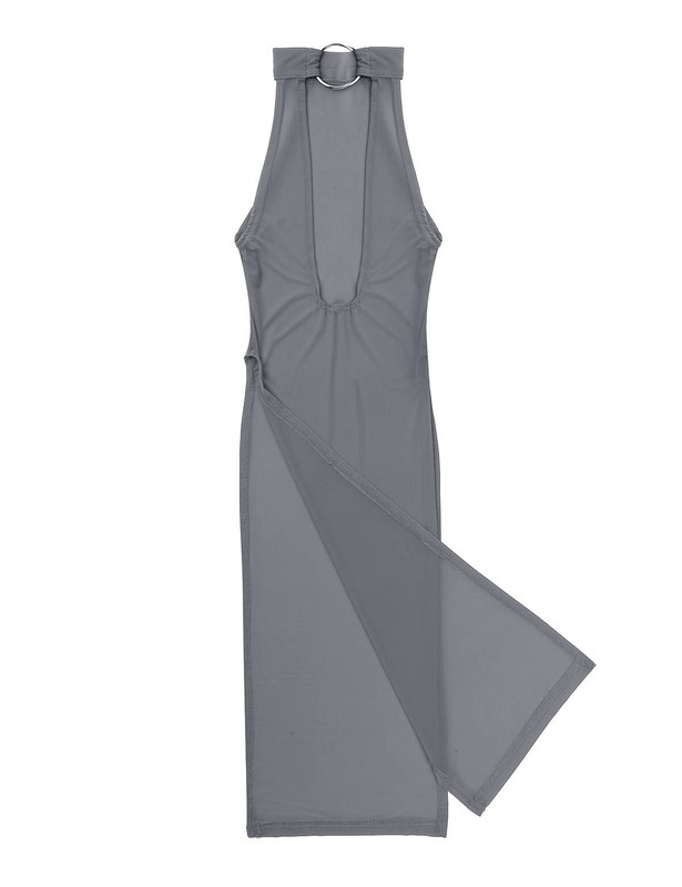 Halter neck with metal o-ring, sleeveless and backless, high slit leg and knee length, not see through.