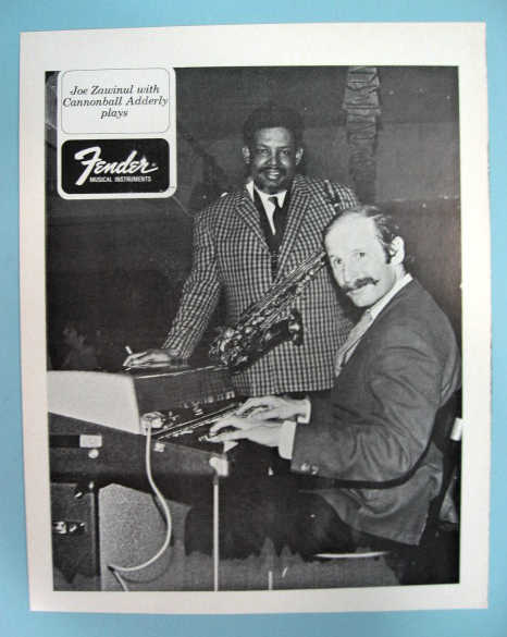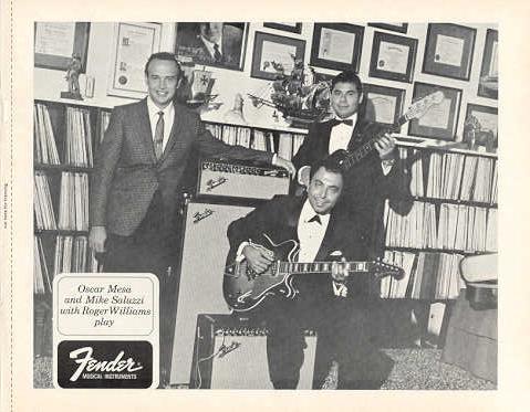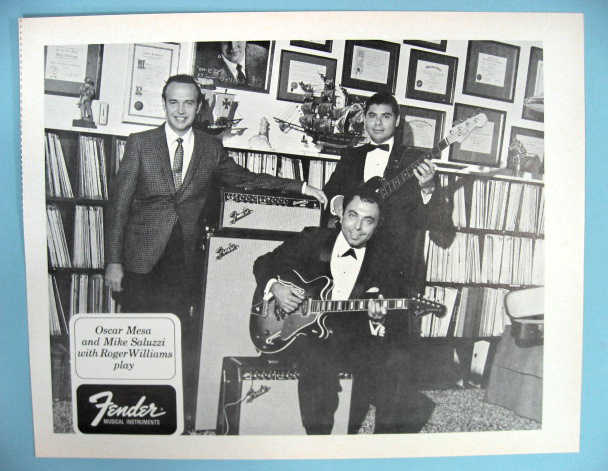 FENDER PROMO PHOTO 1968 OSCAR MESA and MIKE SALUZZI with ROGER WILLIAMS also Joe Zawinul with Cannonball Adderly This original photo of OSCAR MESA and MIKE SALUZZI with ROGER WILLIAMS is from the 1968 "Fender Album of Stars" promotional booklet. The photo was made to be placed in a 8"x 10" frame (the page is slightly larger than 8x10). This original photo from 1968 has a matte finish and was printed on thin paper like magazine paper. It was not printed on professional photo paper as it was placed in the promotional booklet. This photo has another Fender identified photo of the "Joe Zawinul with Cannonball Adderly" on the reverse side.The images below are showing both a scan image and also an image taken with a digital camera. You will only be getting one sheet of paper with a photo printed on each side. This is an original item and not a recent reproduction, copy or dupe. The photos are in near mint (9.5) condition and would look great in your home, office, store, studio, collection, etc. $4.00 U.S.A. Shipping and Insurance. For International and Canadian shipping, email after winning for shipping charges. |