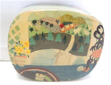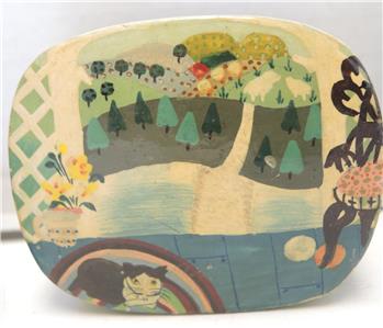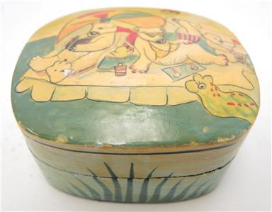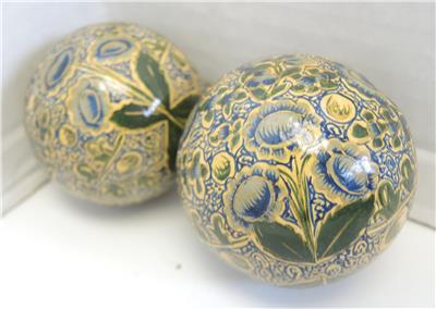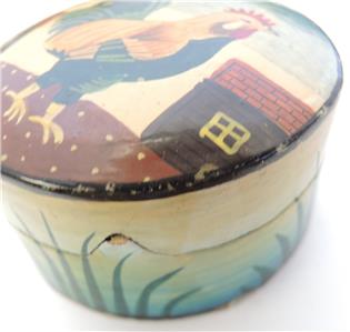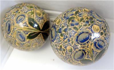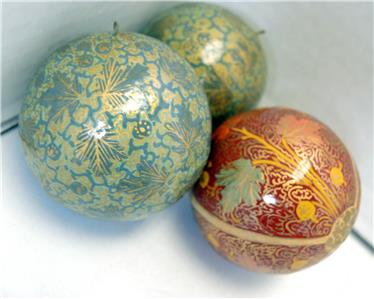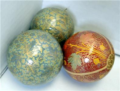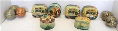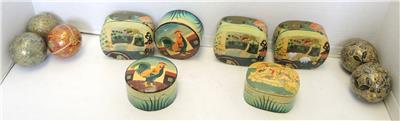Lot of six paper mache trinket boxes along with five paper mache ornaments. All of them were hand-painted and made in Kashmir India. They are in very good to excellent condition. Being sold as a lot. Three of the boxes display a scene of a cat seated on a rug with a view of a garden terrace outside and a chair at the window - 3 1/2" x 3" x 1 1/2" tall. Two boxes display a rooster standing in its barnyard with a building on either side of him. 3 1/4" diameter x 1 3/4" tall. The last box is a comical ice flow scene with a family of polar bears sunning themselves. 1 1/2" tall x 3" x 2 5/8". Has a small flake on the foot of one polar bear. The ornaments are 7 1/2" in circumference - four are the same color and one is red with gold. All are in very good to excellent condition.