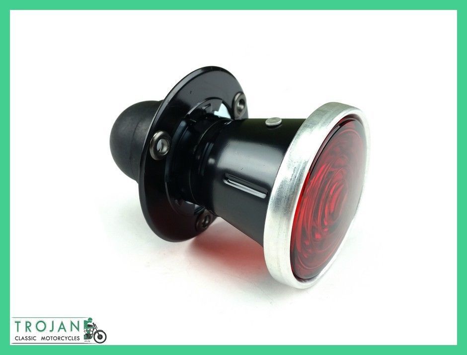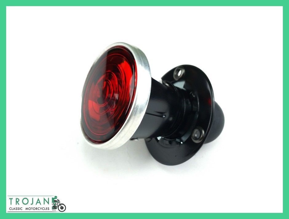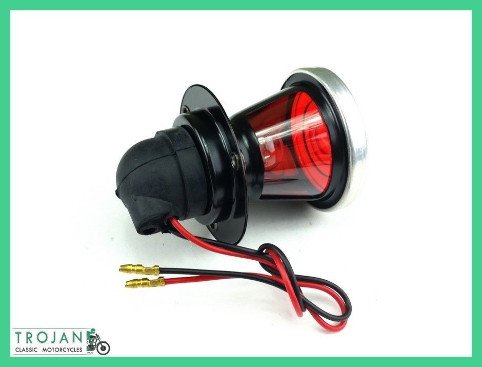 STOP TAIL LIGHT LAMP, LUCAS TYPE, BSA TRIUMPH SUNBEAM, 477/1, 53182B, LU53182B, 477 Replaces OEM Part No: 477/1 (also replaces part numbers: 53182B, LU53182B ) One unit, period correct for British Motorcycles. Excellent finish includes 12V bulb and wiring harness. Approx. measurements: Diameter 60mm, length from lens to base 50mm, to fit 40mm hole. The 12V bulb in this tail light is low wattage and may also work on motorcycles with 6V systems. There are at least four cheap copies of this tail light being manufactured worldwide. Brand new, Superior quality, Arion Pacific Industries. TLP0022
