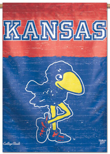 Celebrate the classic greatness of a legendary NCAA program! This amazing banner, from the NCAA College Vault Collection, features the Kansas Jayhawks sporting style of more than a century ago - the original Jay Bird and block-KANSAS script from the early 20th century - printed boldly on quality polyester flag material, and complete with a 1.5" pole sleeve at the top. This is an innovative product that can be flown on a flagpole outside, hung on a curtain rod inside, or simply pinned to the wall like a poster. A bold, brilliant flag that will last for ages and fill that space on your wall or outside your home - the perfect tribute to an amazing school and its historic style!