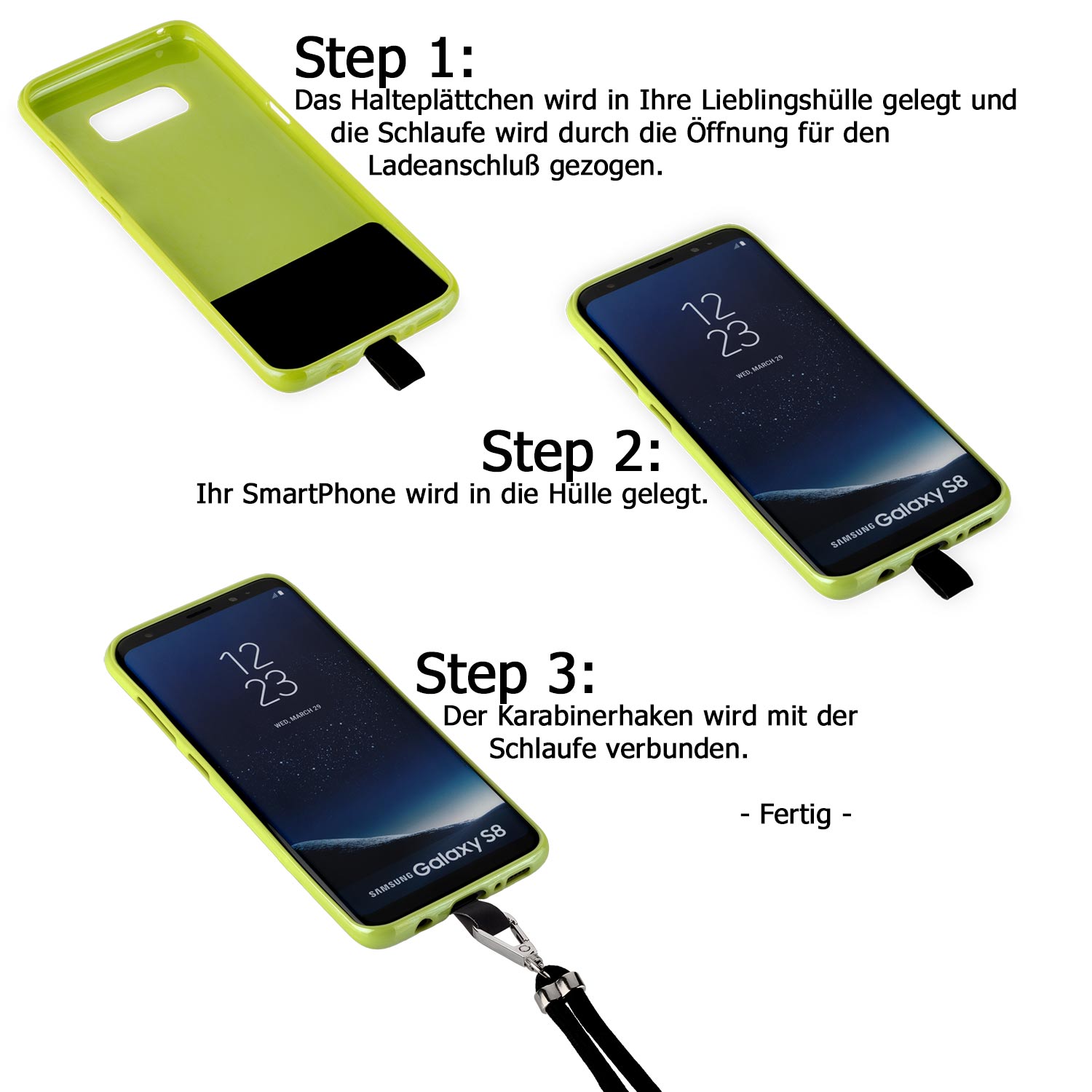 Die Umhängkordel macht aus Ihrer vorhandenen Schutzhülle oder Handytasche eine schicke neue Umhängetasche. Damit können Sie die verschiedensten Schutzhüllen aufwerten und als praktische Umhängetaschen nutzen. Die Umhängkordel ist für alle Schutzhüllen und Taschen geeignet, die eine Öffnung für den Ladeanschluss des Handys haben. Das Smartphone kann mit dieser Kordel als modisches Accessoire cool um den Hals oder an der Schulter getragen werden und ist gleichzeitig optimal geschützt und immer griffbereit. Die Länge der Umhängkordel kann, passend zum eigenen Style, durch einfaches Ziehen individuell angepasst werden. Metallkappen an den Enden der Kordel sorgen für einen coolen Look. Ein Ladekabel kann weiterhin problemlos angeschlossen werden.
