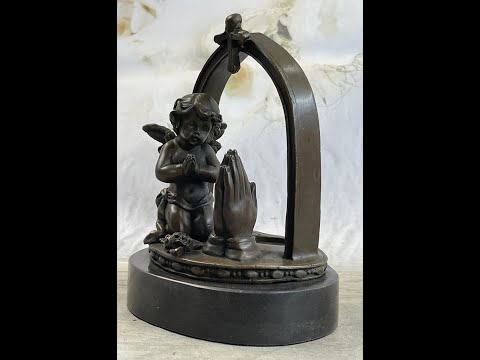 This particular sculpture, depicting a serene praying angel, is a testament to the skill and dedication of the craftsmen. The angel is captured in a moment of peaceful devotion, with exquisite attention to detail that highlights the grace and elegance of the figure. The bronze is given a rich patina finish, enhancing its timeless beauty and ensuring its durability for generations to come. The sculpture is mounted on a round black marble base, adding a touch of sophistication and stability to the piece.