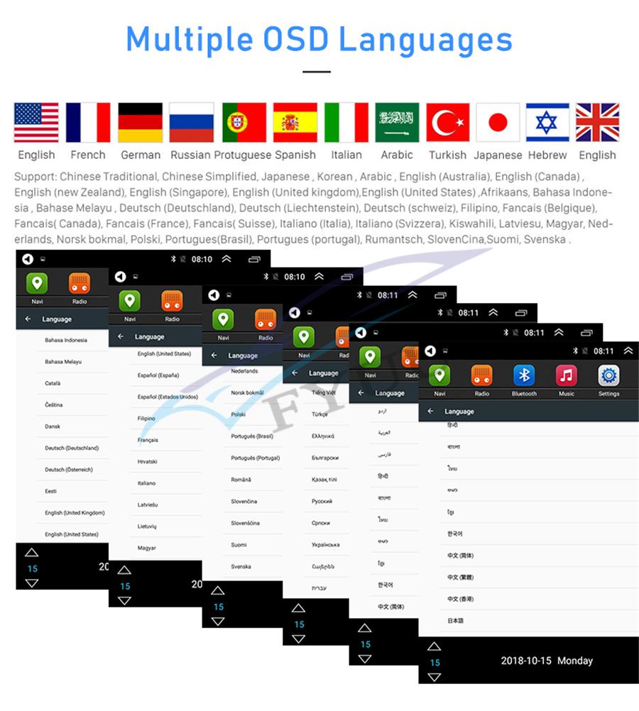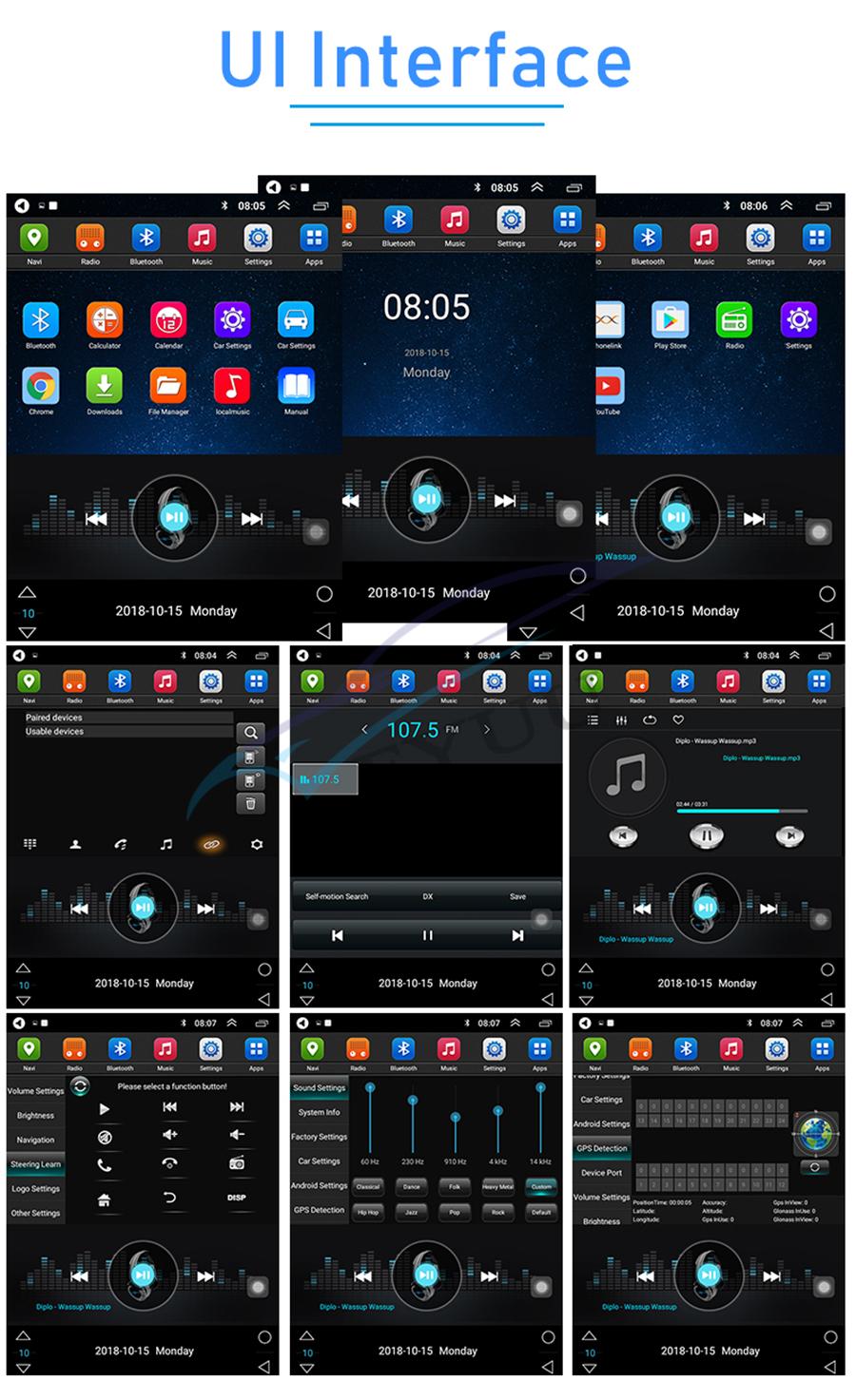 Setup | - WiFi/Hotspot/Bluetooth: Yes - Brightness level adjustable: Yes - Wallpaper: Wallpapers/Live Wallpapers/Gallery - Sound: Key Tone & Volume - Storage: Display Internal Storage/Nand Flash/Connected Device Storage - Apps: Running Apps display/force stop/uninstall - Security: Yes - Accounts: Yes - Languages and Input: more than 70 Languages and choose input method - Backup and Reset: Yes - Date and Time: Setting Date&Time by yourself or choose GPS/network-provided time - Accessibility: Yes - GPS: Yes, GPS application options/monitoring/sound mode/mixing ratio - Driving safety: Watching Video, Reversing X-mirror/Volume, Reversing Trajectory/radar Display, Rear view ruler - Amplifier: Rock/Pop/Jazz/Classic/Flat/Voice/Custom - Steering Wheel Control: Yes - About Device: Display Parameter Info. |