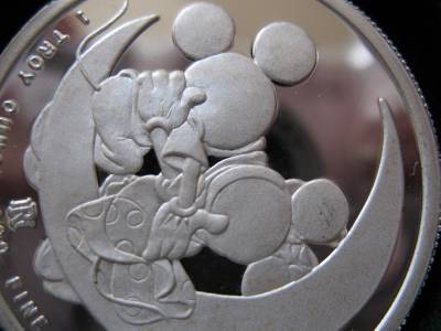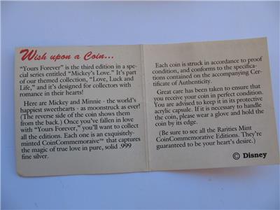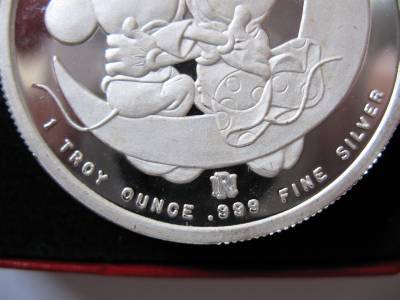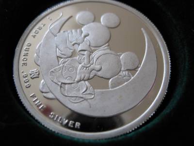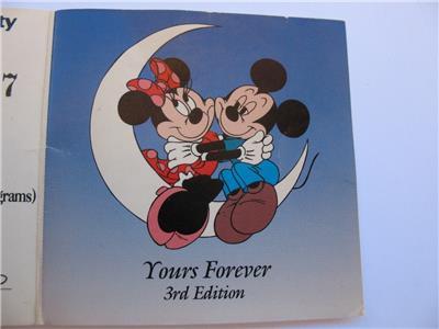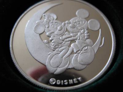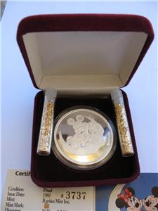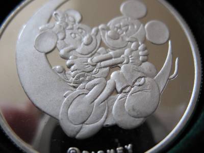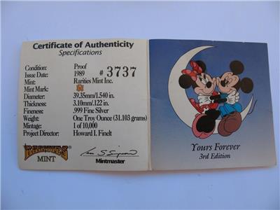 You are bidding on1-OZ. SILVER MICKEY & MINNI LOVERS ON CRESENT MOON VERY RARE VINTAGE COIN+GOLD "FROM YOURS FOREVER SERIES" 3RD LIMITED EDITION WALT DISNEY RARITIES MINT COLLECTORS PROOF COIN VERY LOW # 395 ON EDGE AND COA, Very Unique Art round, B/U. FLOWERS WILL WILT, GIVE A GIFT THAT WILL LAST AND BE REMEMBERED FOREVER .This JUST LIKE the coin you will receive and is in mint condition. It is really beautiful in its detail. Besides being a great collectors item, pure Silver is up in the last 10 years and art rounds are bringing a premium over the spot price of silver from investors and collectors. This is a fun way to invest in silver and have a beautiful coin. Great gift FOR SOMEONE SPECIAL or add to a collection.