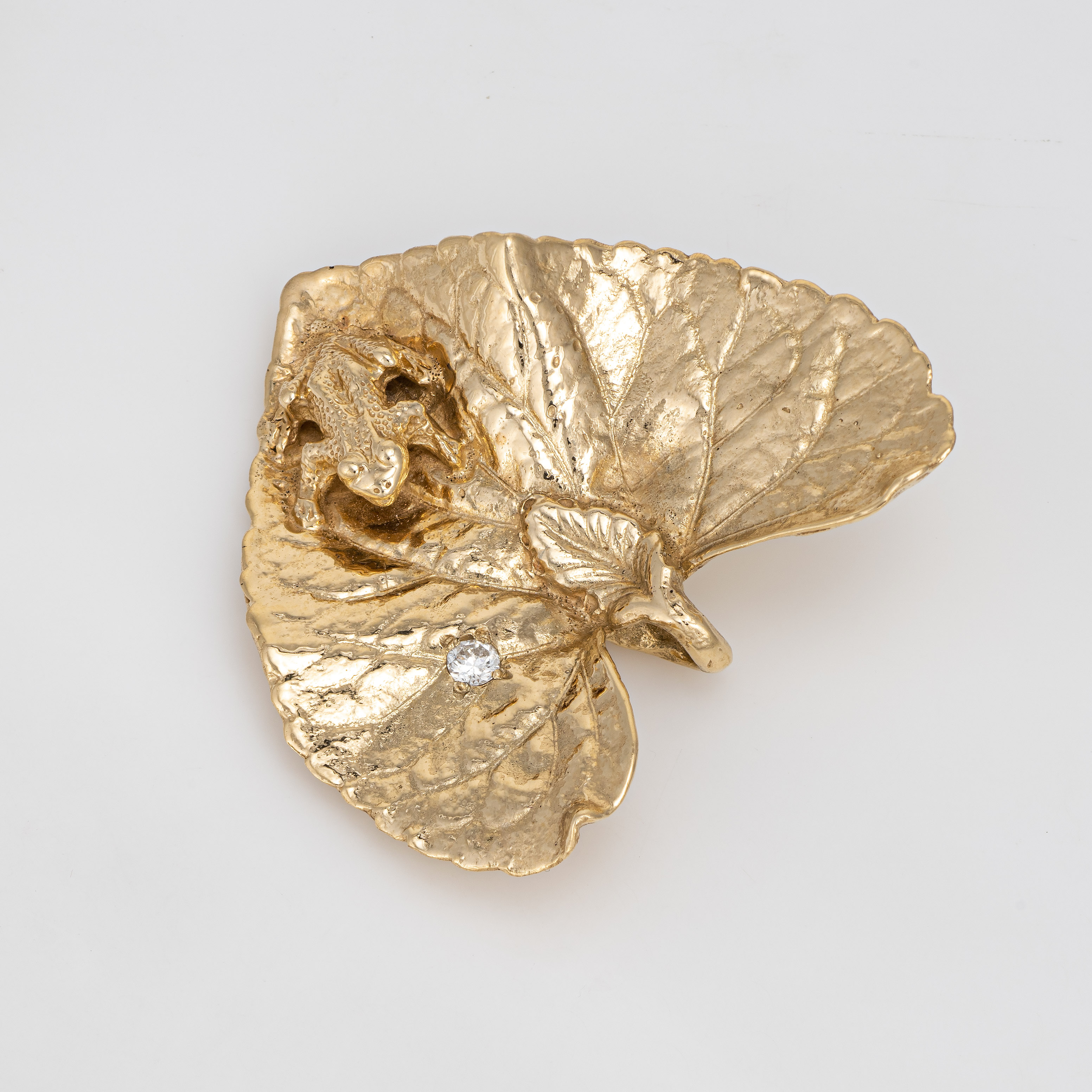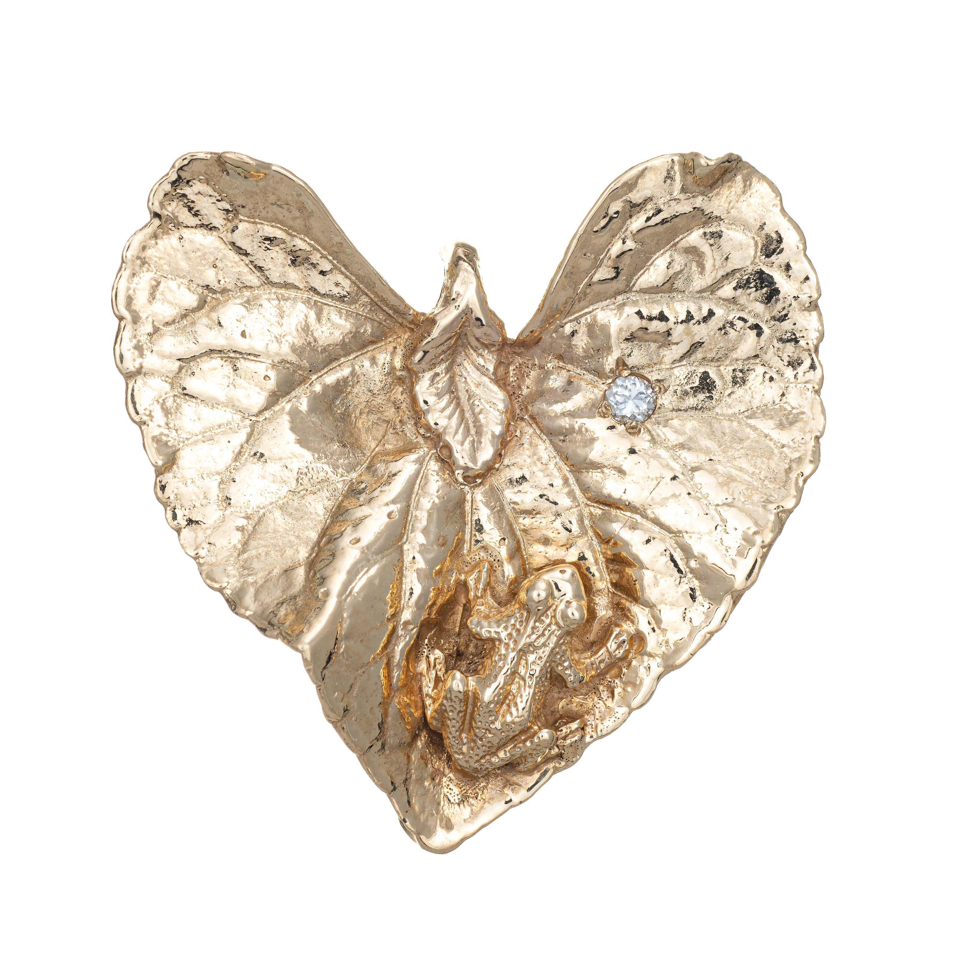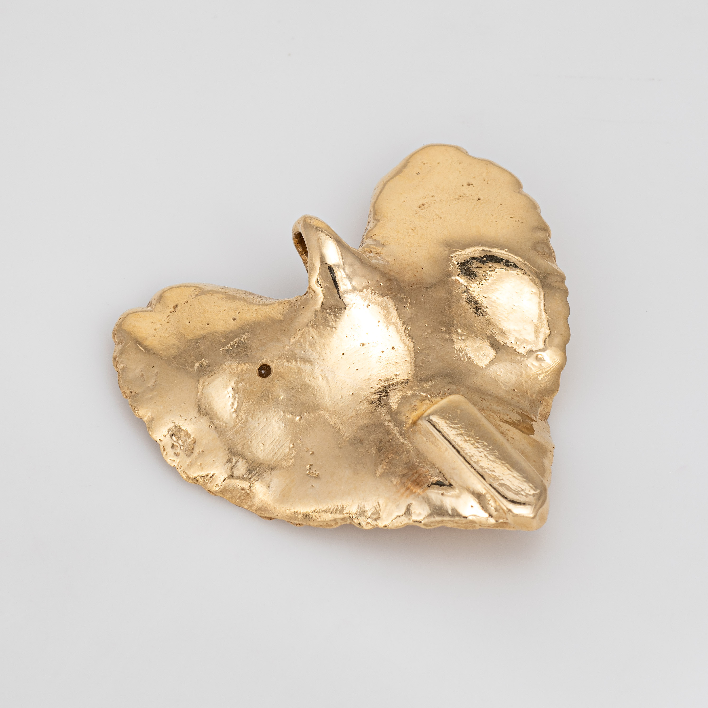 The charming heart shaped leaf features textured lifelike detail, with a dainty frog to the base. The pendant has a heavy feel weighing in at hefty 24.5 grams of 14k gold. The bale measures 3mm wide and can accommodate a thin to medium thickness chain.