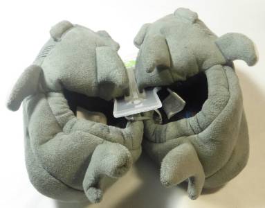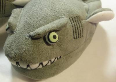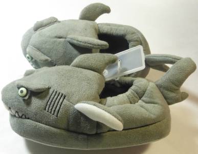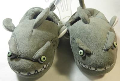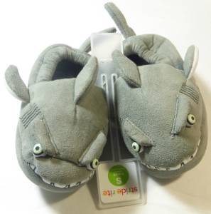 This darling pair of light grey gray shark slippers is so cute and will keep your little boy warm while running around the house. The shark with the flippers and fins has bulging cloth eyes that glow in the dark and is showing his teeth in a big smile. The Small Size 7-8 measures about 6 ½” and has the non-skid Stride Rite trademark on the faux suede soles. They have a black lining with the Stride Rite label.