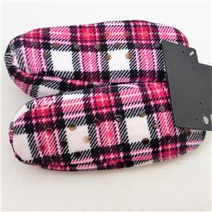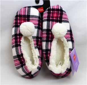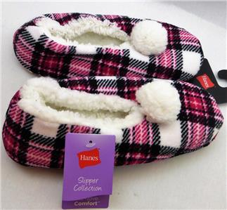 Hanes Slipper Collection Comfort Soft slipper socks are super comfortable and perfect for any weather. They are made of 100% polyester and have non-skid soles. The rose plaid slippers are white with red/rose/black plaid and a white pompom on the top and white fleece lining; Size Small fits size 5 to 6 shoes and measure about 9” from heel to toe. They are machine or hand washable and should be dried flat.