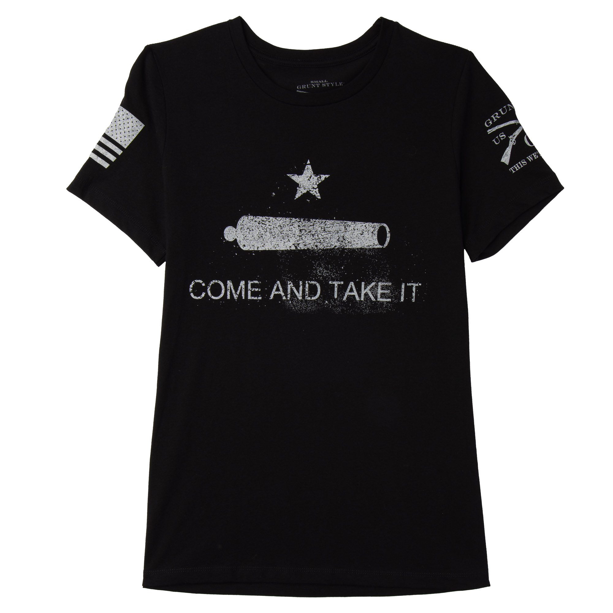 The Grunt Style Women's Come And Take It T-Shirt is crafted with 100% combed ring-spun cotton in black and 90% combed ring-spun cotton in heather gray for soft, all-day comfort and wear. It features a tagless, itch-free design and ribbed collar that won't lose its shape. It also has double-needle stitching for durability. There's no better way to show your American pride than sporting your favorite shirt from Grunt Style.