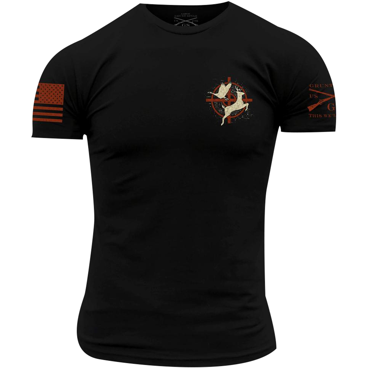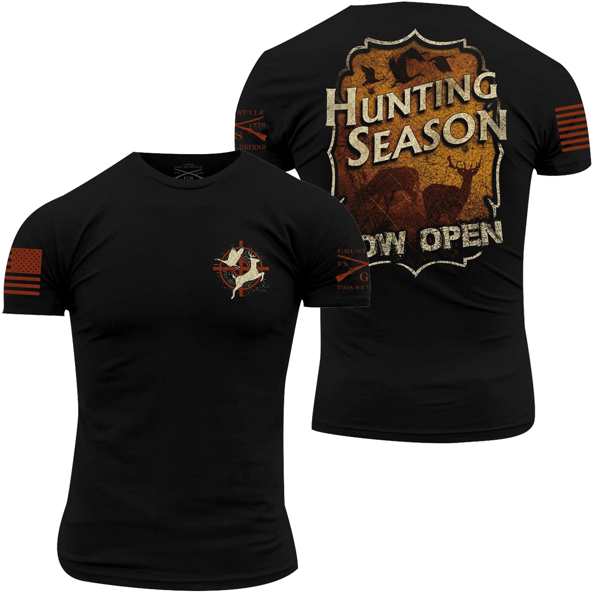 Hunting season now open! The Grunt Style Vintage Hunting T-Shirt is crafted with 100% combed ring-spun cotton for soft, all-day comfort and wear. It features a tagless, itch-free design and ribbed collar that won't lose its shape. There's no better way to show your American pride than sporting your favorite shirt from Grunt Style.
