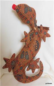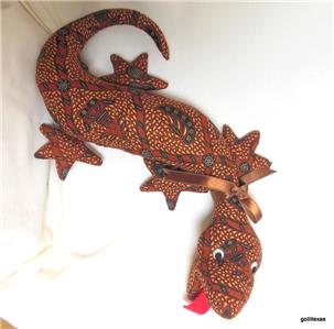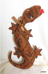This lizard looks like he was made from an African Tribal print fabric. There is no ID...Love his expression and that open mouth...and those star shape feet. Preloved...but this lizard looks perfect to me.