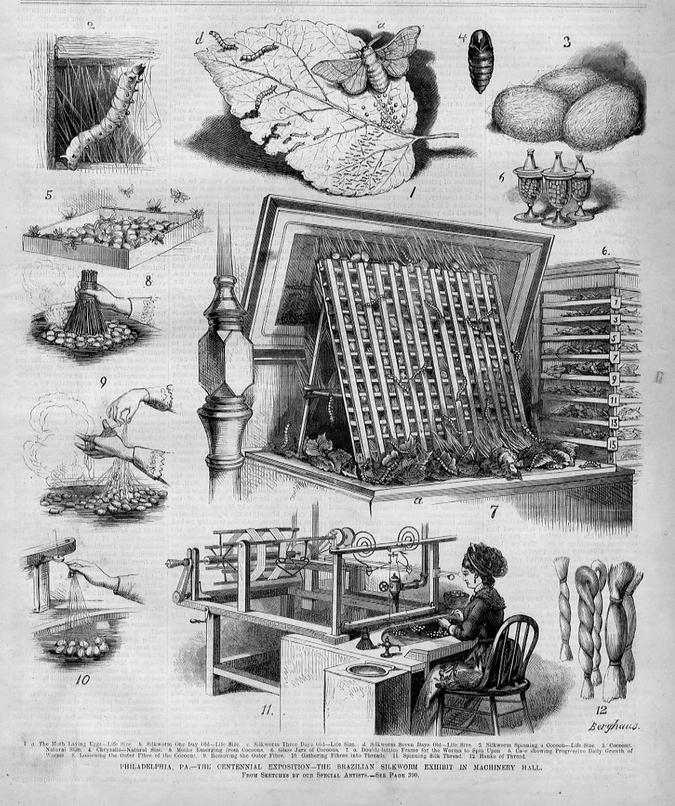 This genuine antique wood-cut engraving is titled "PHILADELPHIA PA. - THE CENTENNIAL EXPOSITION - THE BRAZILIAN SILKWORM EXHIBIT IN MACHINERY HALL", published in "Frank Leslie's Illustrated" August 1876. This dated engraving from the year of 1876 is 11 x 15 inches in size with wide margins. It is in excellent condition, highly displayable and ready for framing and is guaranteed to be as described. I do not deal in copies/reproductions.