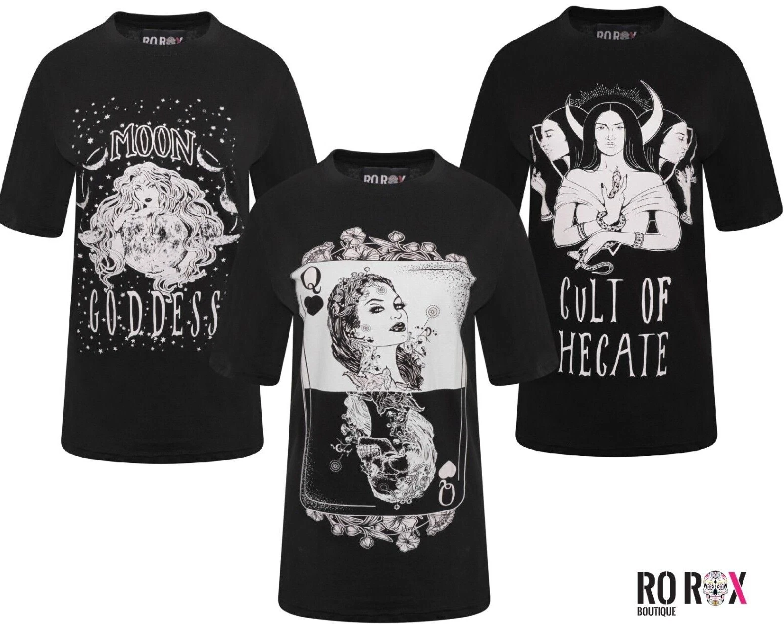𝐑𝐨 𝐑𝐨𝐱 presents oversized gothic t-shirts, a testament to edgy style and bold expression. This black tee boasts a striking white print that adds a touch of intrigue to any ensemble. These women's t-shirts come with an oversized fit, rib-knit round neckline, and short sleeves. These provide both comfort and statement-making appeal. At approximately 77.5cm/30.5" long (based on UK14), it offers a flattering silhouette for various body types. Our goth style ladies t-shirts are made from 100% cotton. This tee ensures durability and breathability, making it suitable for year-round wear. Its gothic theme evokes a sense of mystery and enchantment, perfect for those with a penchant for the dark and dramatic. Choose from a captivating array of designs, including the Cult Of Hecate Triple Goddess, Queen Of Hearts Playing Card, and Selene Moon Goddess Wicca, each exuding its own mystique and charm. Ideal for casual outings or as a standout piece for themed events, this oversized gothic t-shirt is a versatile addition to any wardrobe. Pair it with jeans for a casual vibe or layer it with a leather jacket for an added edge.