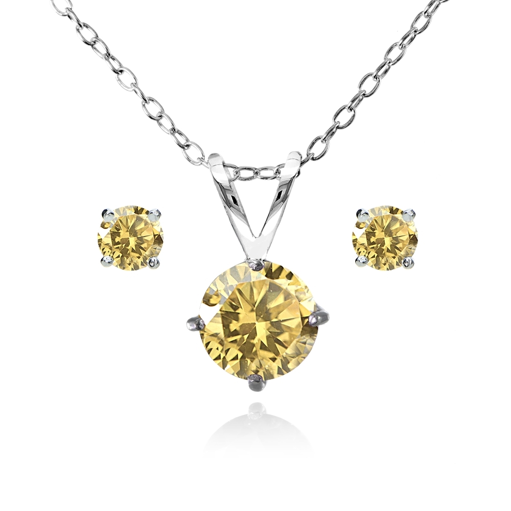 | This classic jewelry set showcases a round solitaire pendant and matching stud earrings. The pendant showcases a sparkling 7mm citrine gemstone and dangles from a thin 18-inch rolo chain. The stud earrings feature two 5mm citrine stones and is secured with post and friction backs. The jewelry set is crafted of sterling silver. S11684C |