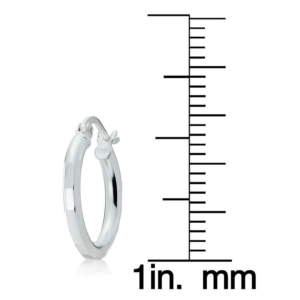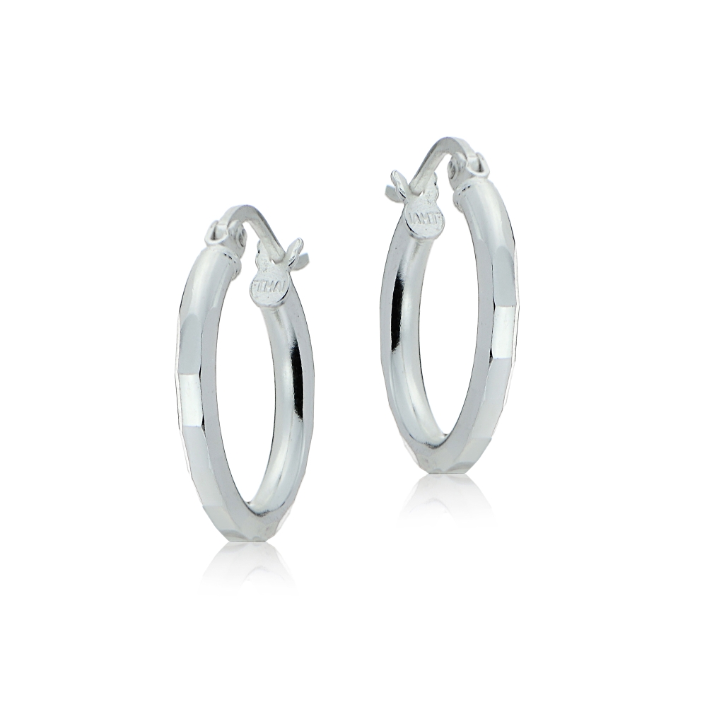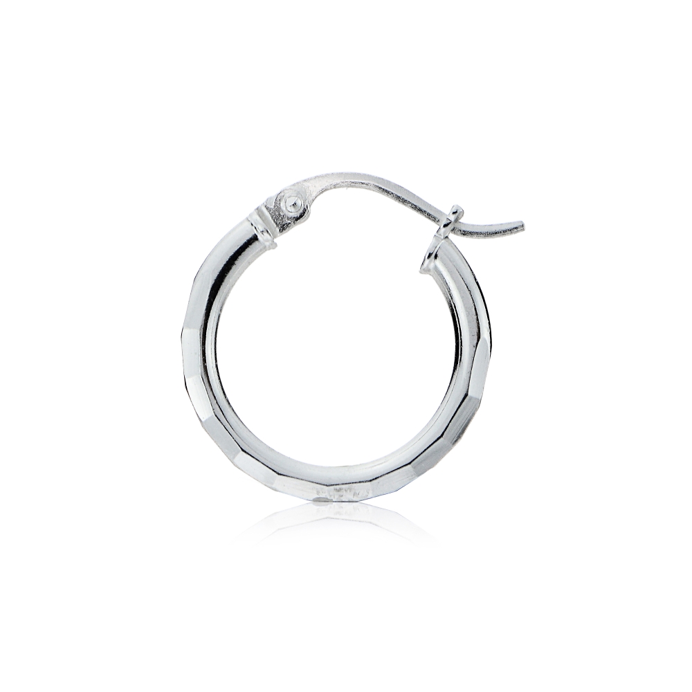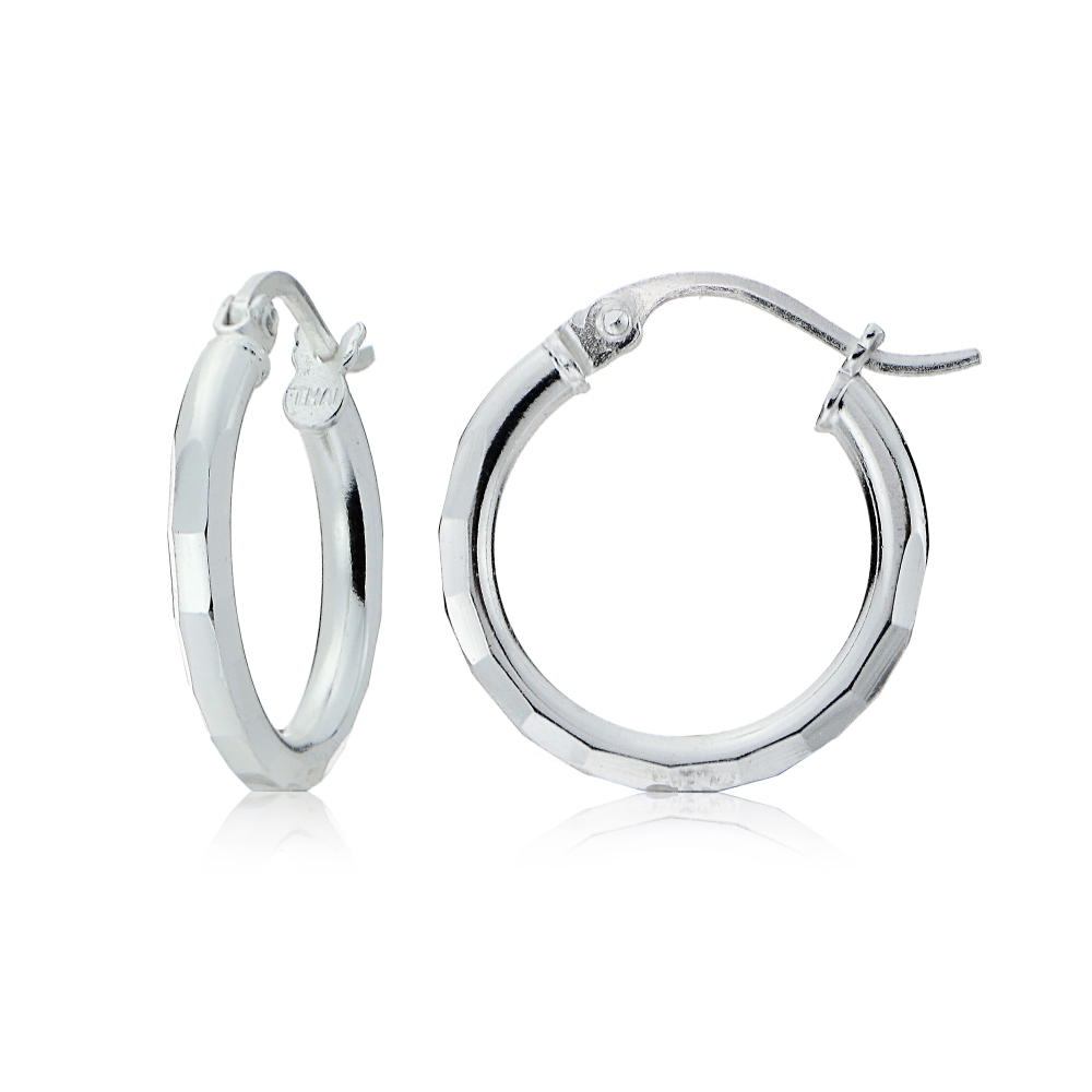| These earrings feature sterling silver hammered high polished round hoops. They are 15mm in diameter. H14643-15 |