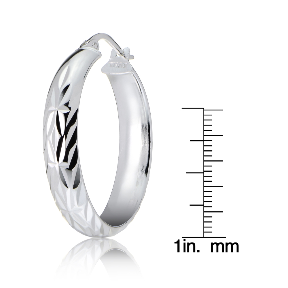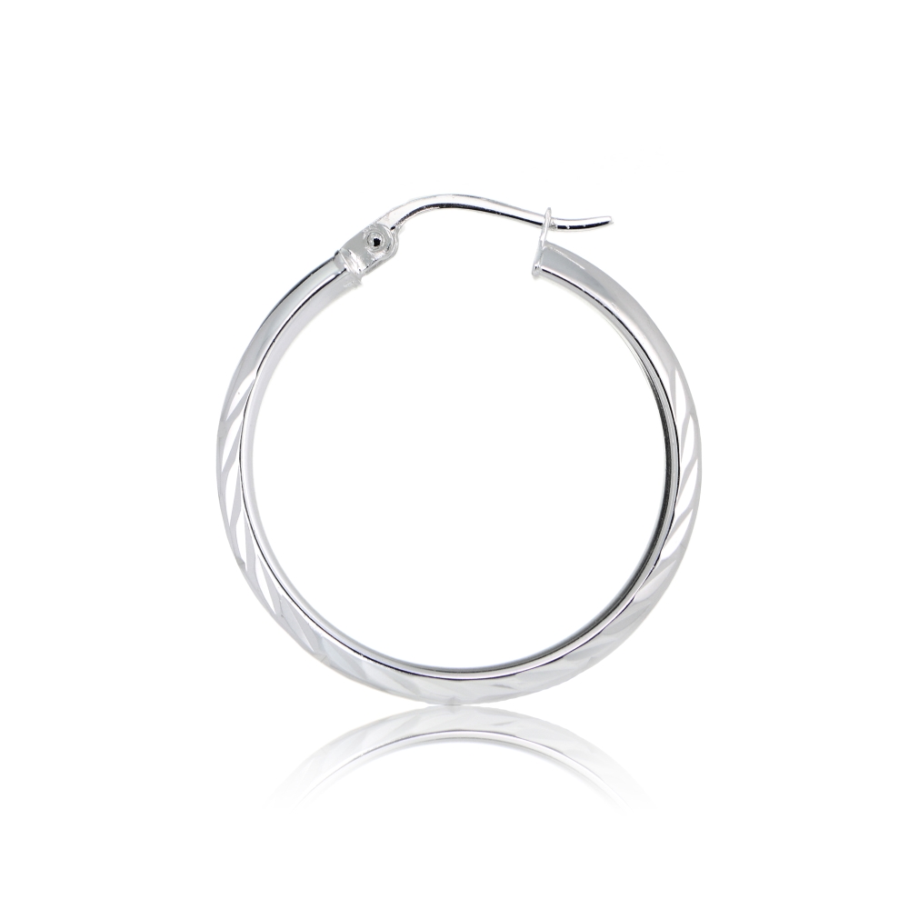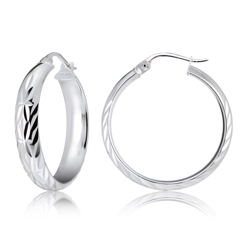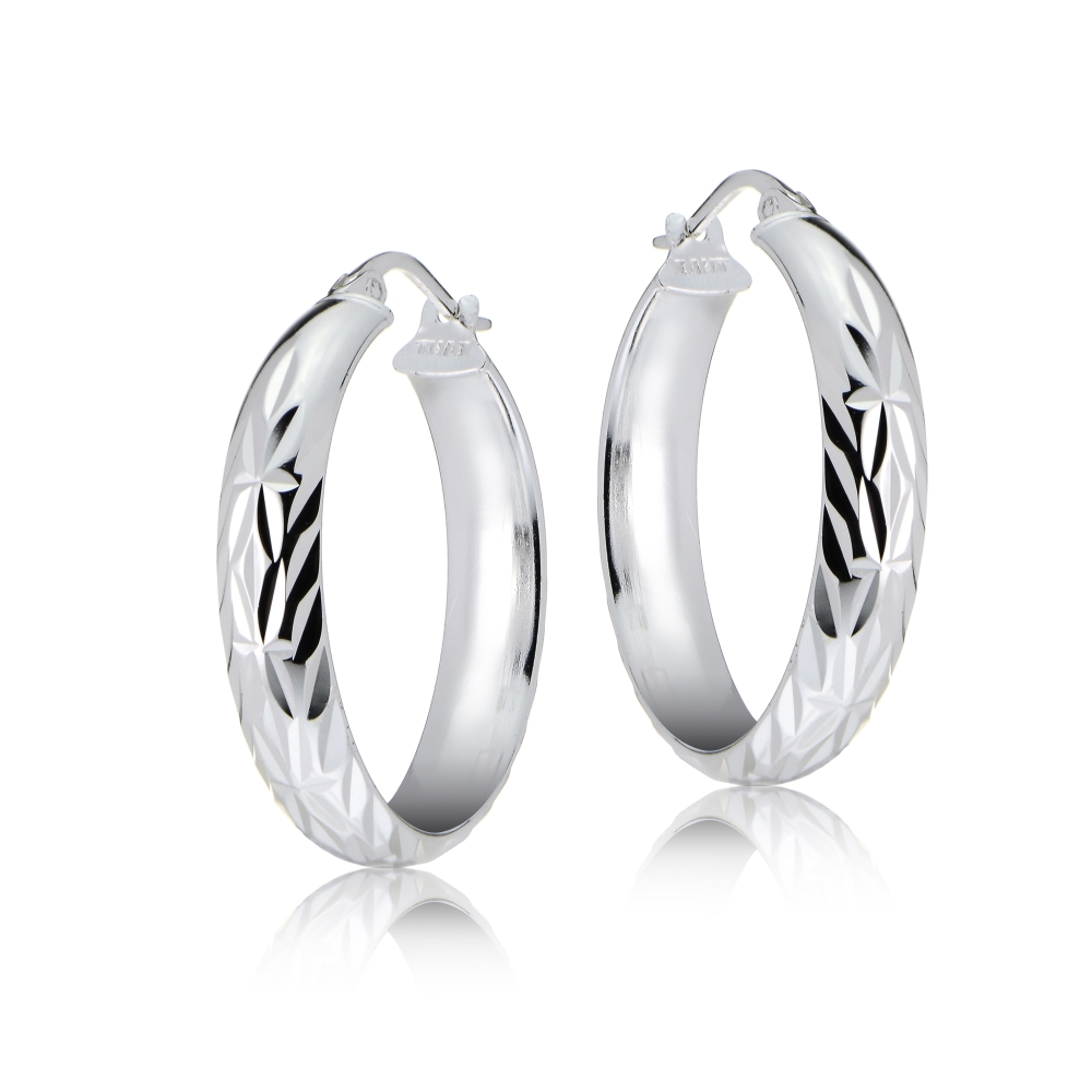 | These attractive hoops showcase a diamond cut half hoop design earrings. They are secured by post with snap down backs and crafted of sterling silver. They are 40mm in diameter. H14655-40 |