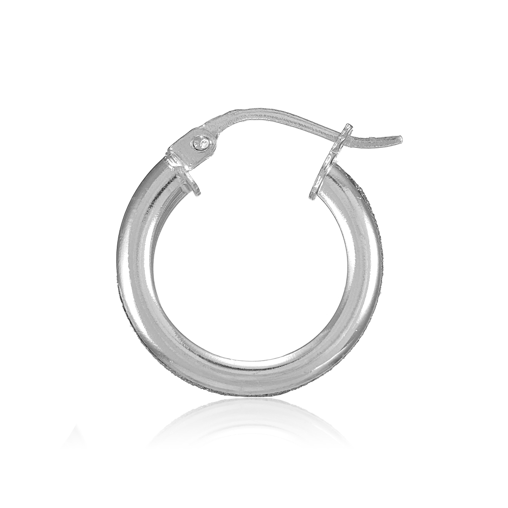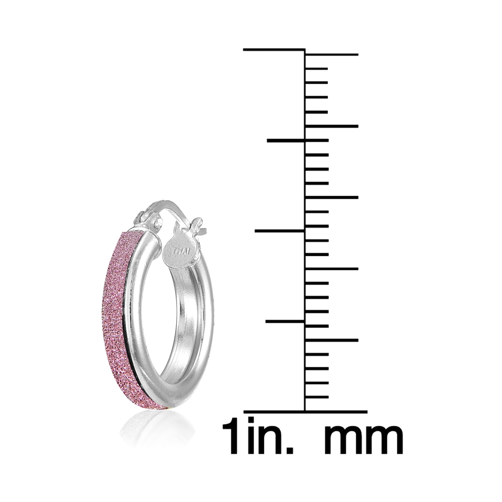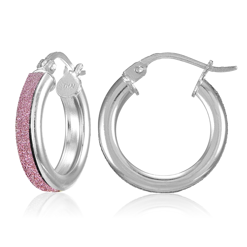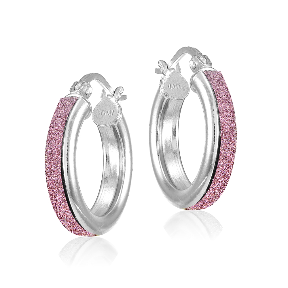 | Add a touch of sparkle with these pink glitter hoop earrings. Created with sterling silver the earrings are covered in a pink glitter fabric generating a shimmering effect. It secures to the ear with post-with-snap-down backs. H14974PK-15 |