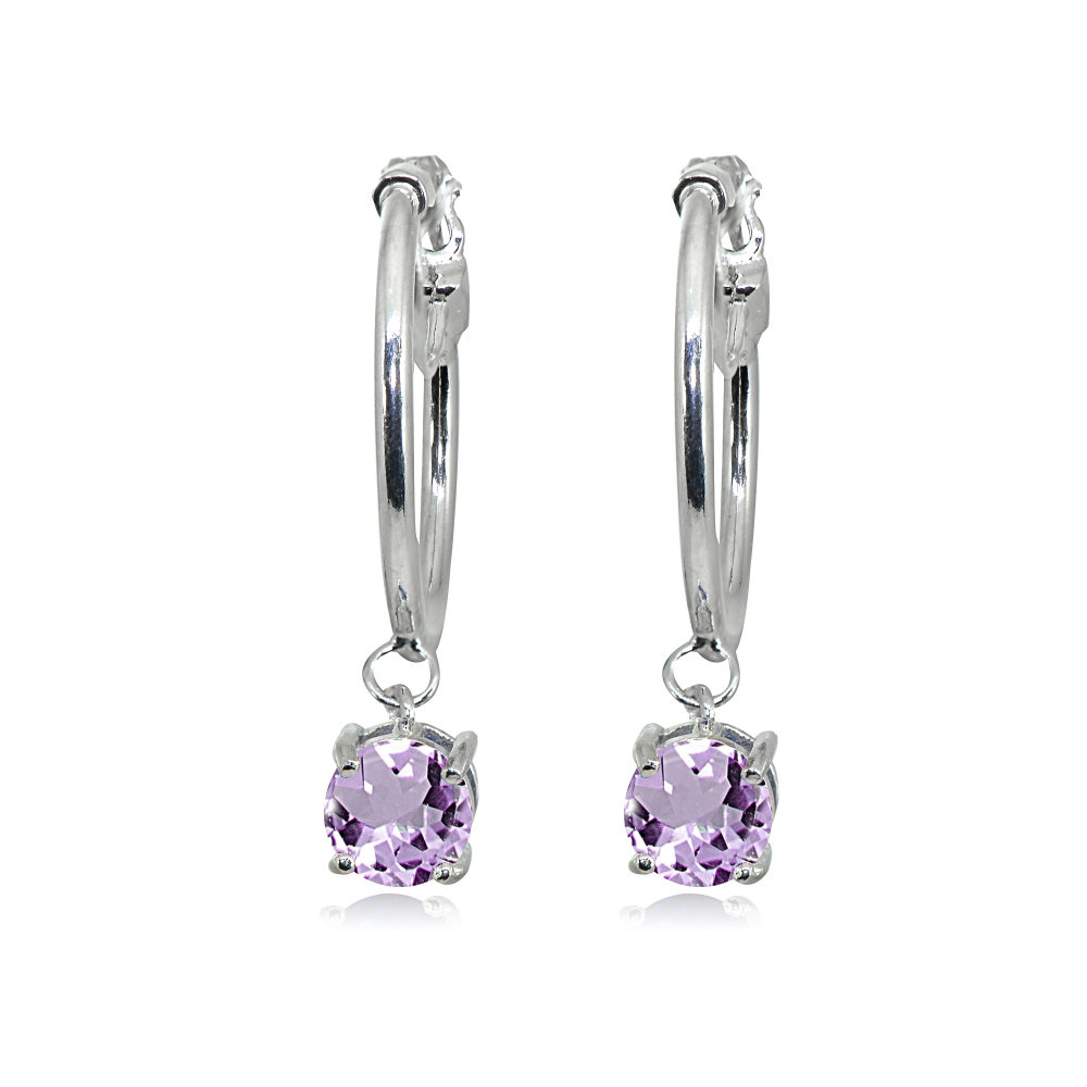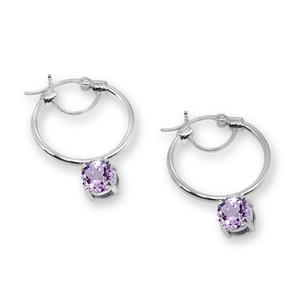 | These attractive 20mm hoop earrings for women feature polished round hoops with dangling 6mm amethyst gemstones. These hoops are crafted of fine sterling silver and are nickel & tarnish free. They secure by post with snap-down backs. H16081A |